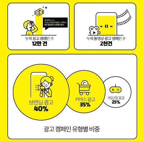 "캐시슬라이드"는 5년 넘게 운영된 서비스인 만큼 독보적인 기록들을 보유하고 있다. 누적 광고 캠페인 수는 서비스 론칭 초기 50건 수준에서 월 8천 건 수준까지 증가해서 누적으로 12만 건이 넘는다. 이중 브랜딩 광고가 40%, 커머스 광고가 35%를 차지하며 일반적인 메인스트림 광고시장 내 구성비율과 크게 다르지 않아 보인다.
