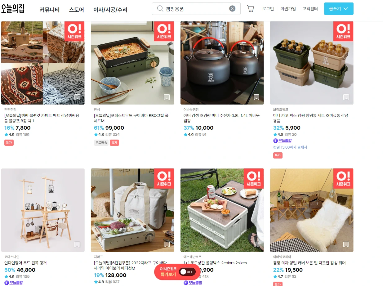 새로운 전략을 찾기가 굉장히 어려웠다. 이미 리빙 커머스 분야에 있어서 오늘의집은 이미 사용자들에게 인정받는 고유 가치를 찾은 서비스이기 때문이다. 계속 서비스를 둘러보는 중에 커뮤니티와 커머스가 연결이 잘 안 생기는 카테고리를 발견했다. 바로 '캠핑용품'이다. 커뮤니티 내 집들이에서는 캠핑과 관련된 카테고리가 따로 없기 때문에, 검색을 통해서 '캠핑'키워드를 찾아야만 집들이 글을 찾을 수 있었다.