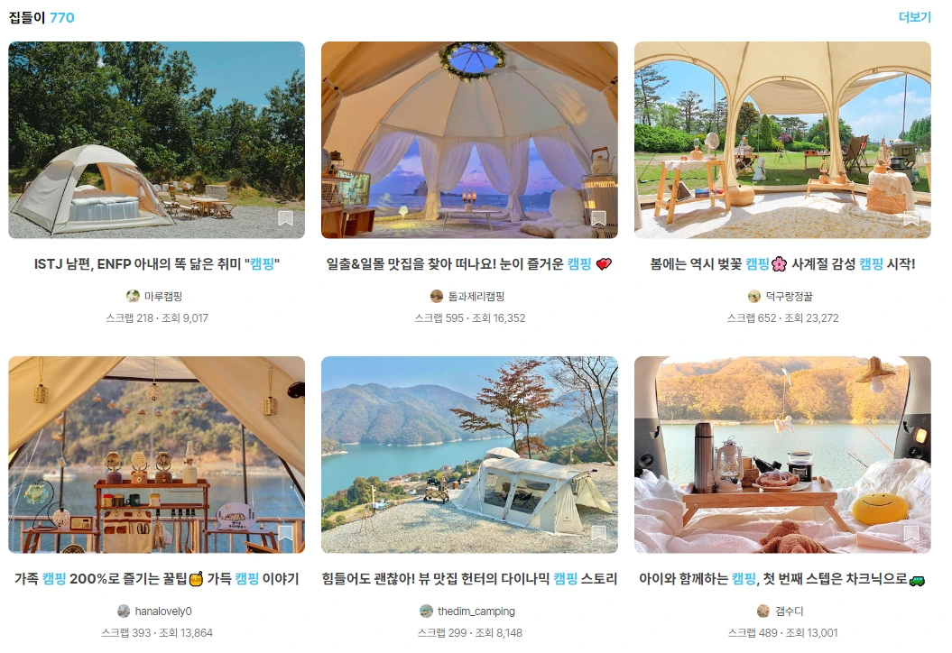 가설 = '집들이' 카테고리에 캠핑을 따로 분류하거나, 캠핑에 관련된 팝업 카테고리를 만든다면, 캠핑과 아웃도어 용품에 관심이 높은 고객들이 글에 반응할 것이고 커머스로 연결 경험을 통해, 관련 고객들의 커머스 구매 전환율을 높일 수 있을 것이다.