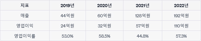 약 2년 전인 2020년 매출 60억 원, 영업이익 32억 원과 비교하면 매출과 영업이익 모두 3배 이상 증가하며 폭발적인 성장세를 보였다.