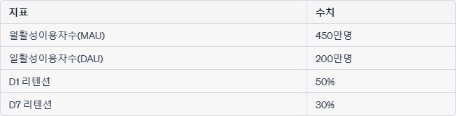 - 참고로 글로벌 상위 앱들의 평균 D1 리텐션은 25%, D7 리텐션은 10% 수준이다.