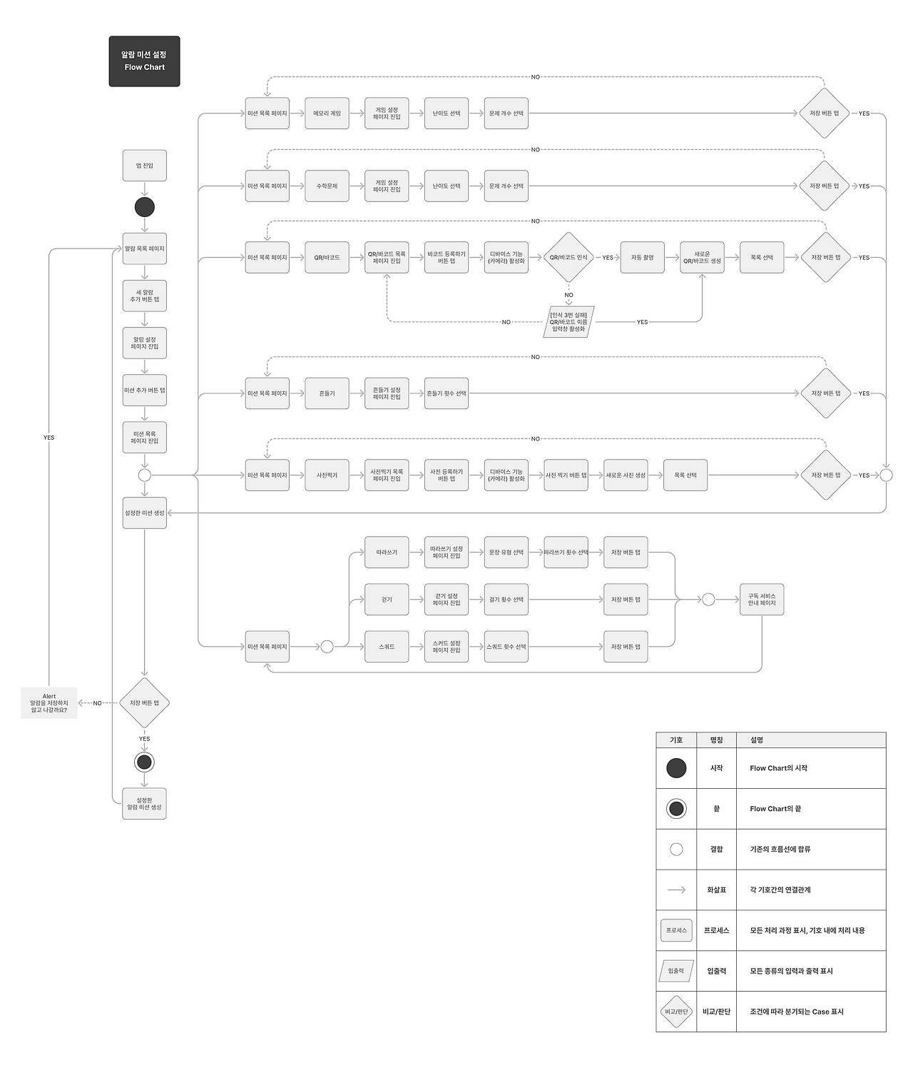 사용자가 앱에 진입한 순간부터 '알람 미션 설정'까지의 흐름을 Flow Chart로 구현해 보았다. 이때 'UI, 클라이언트, 서버, DB'는 다음과 같이 작동될 것으로 예상된다.