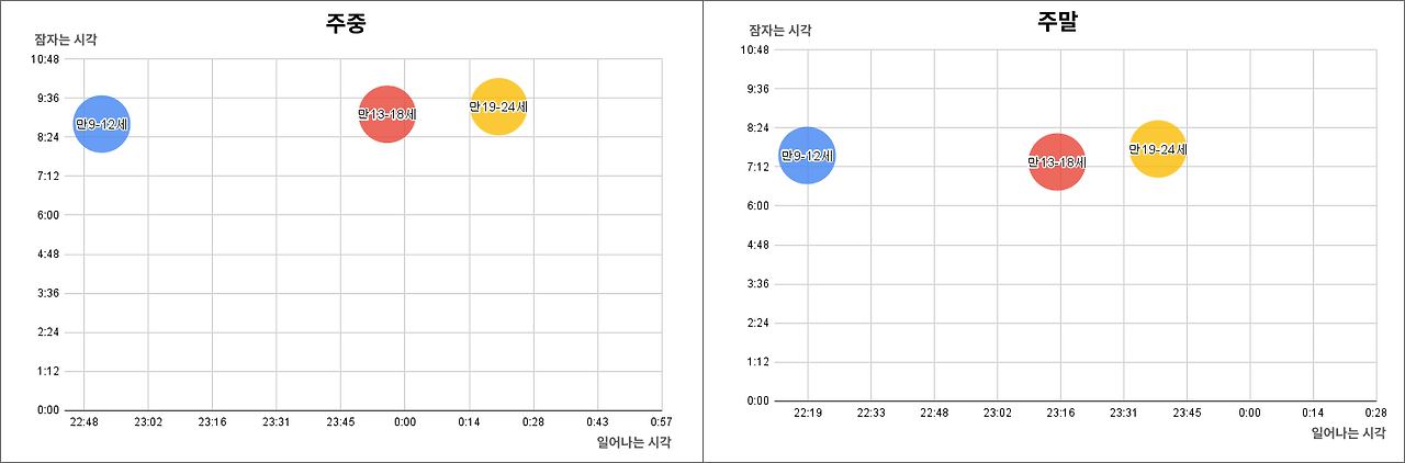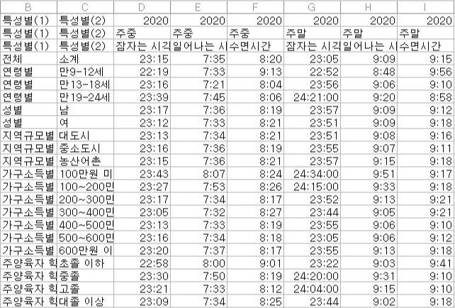 아래 데이터는 2020년 '청소년 정책과'에서 조사한 만 9세~24세의 평균 수면시간이다.