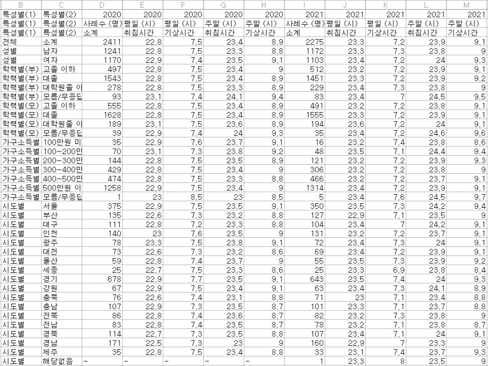 아래 데이터는 2020년, 2021년 '한국청소년정책연구원'에서 조사한 초등학교, 중학교 학부모들의 평균 수면시간이다.