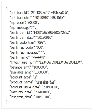 bank_rsp_code: 참가기관 응답코드bank_rsp_message: 참가기관 응답메시지bank_name: 개설기관명savings_bank_name: 개별저축은행명fintech_use_num: 핀테크이용번호balance_amt: 계좌잔액