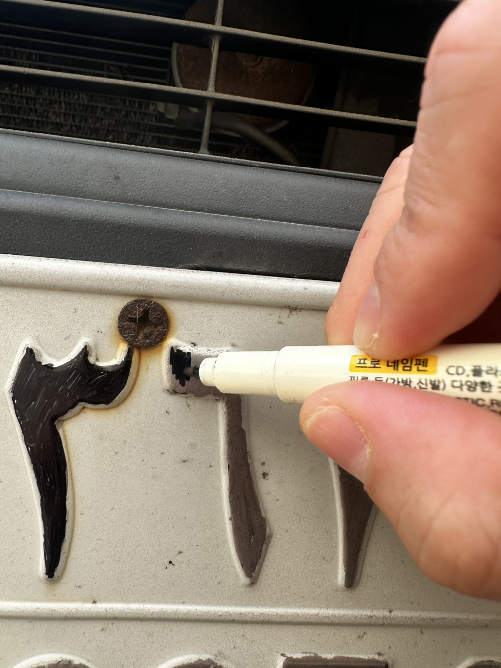 그래서 검사소 옆에 주차를 하고 쪼그려 앉아 검정색 국산 네임펜으로 열심히 칠해 주었다.