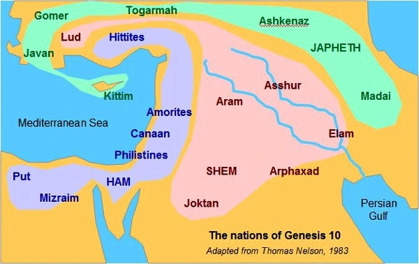 성경과 길가메시 서사시에서 소개되는 대홍수 사건 이후 노아는 세 아들의 가족과 살아가는데, 셈(Shem), 야벳(Japheth), 그리고 함(Ham)이 그들이다.