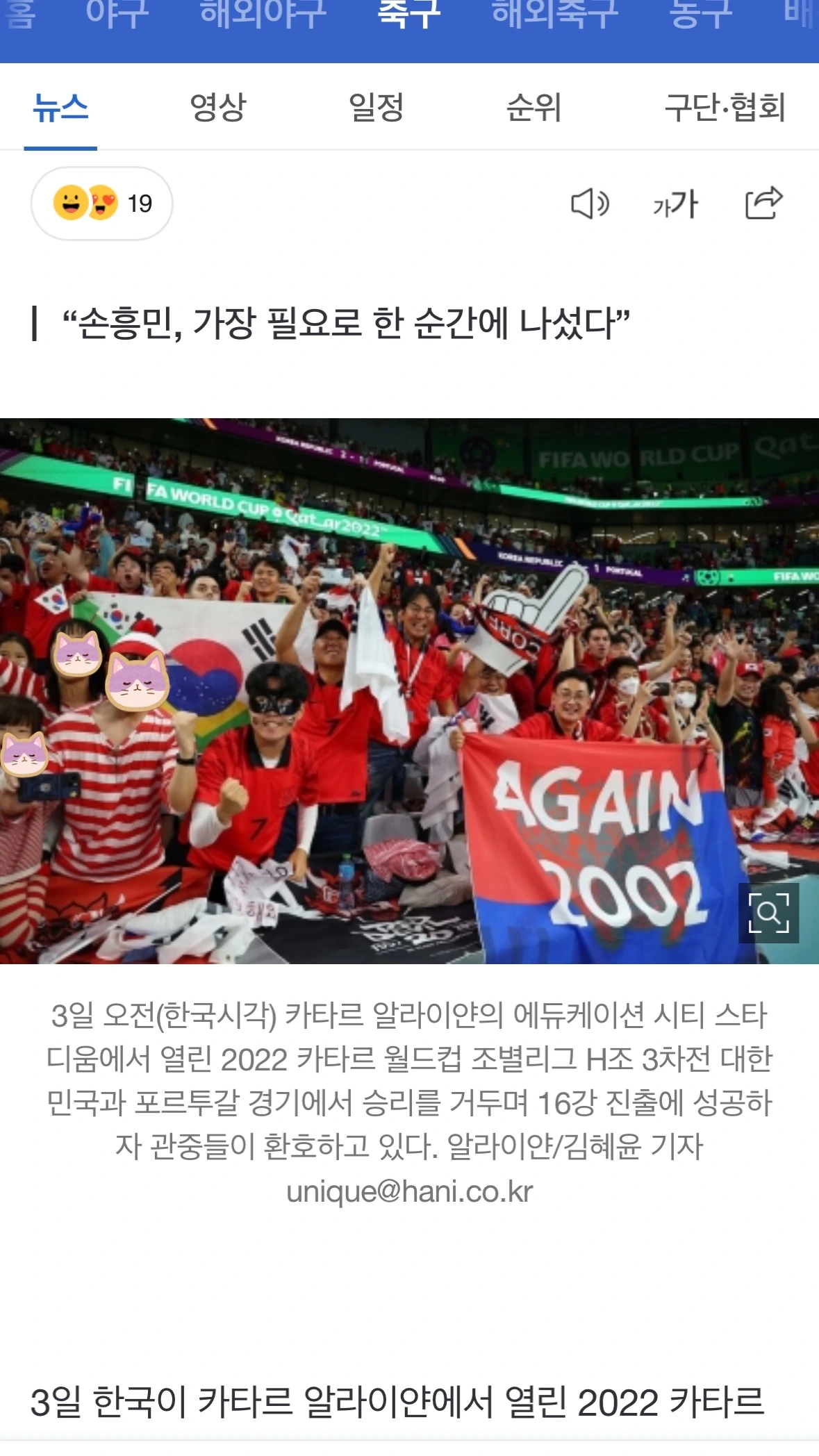 돌이켜보면 월드컵 관련 첫 인터뷰는 2014년 브라질 월드컵 거리응원이었다. 광화문에 위치한 회사에 다닐 당시 광화문 광장에서 거리응원에 참석했는데 전반전이 끝난 뒤 "출근시간 다 되어가는데 어떻게 하실 거예요?"라는 리포터의 질문에 답변하는 장면이 방송으로 나갔더랬다. 경기가 끝나고 1시간이나 늦게 출근했던 그때 팀장님은 말이 없으셨고 난 그해 겨울 회사를 떠났다. (이것 때문에 회사를 그만둔 건 아니다.)