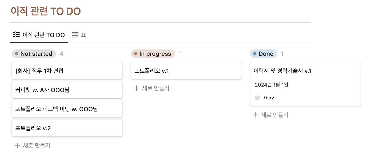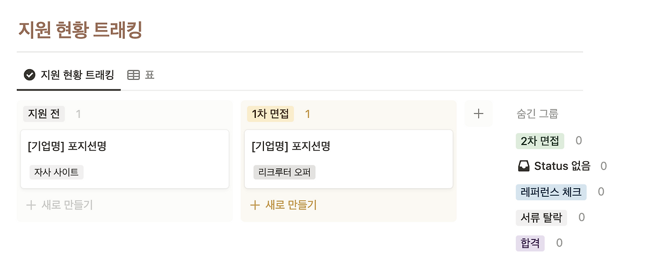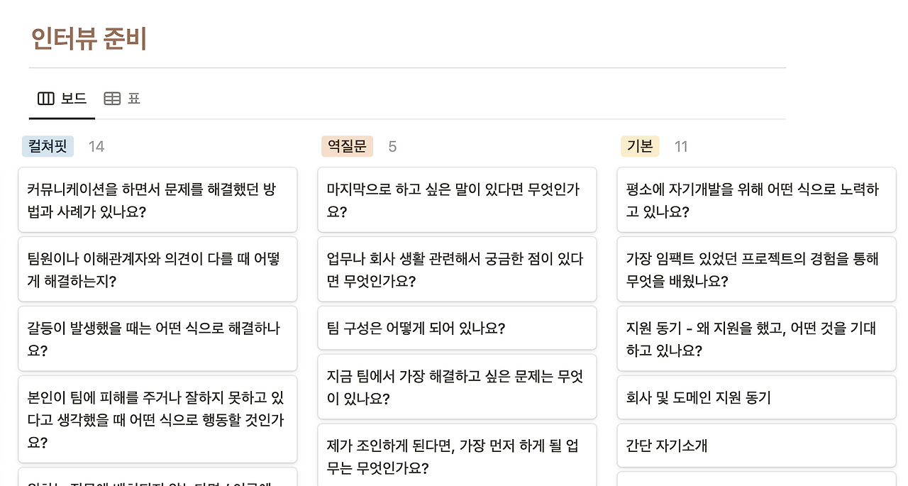 서류 준비부터 커피챗, 인터뷰의 기록 및 일정을 관리할 수 있는 칸반보드예요.