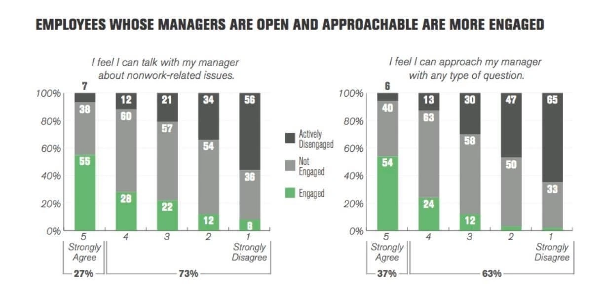 사진에 나와있듯 상사에게 업무와 관계없는 개인적인 대화를 할 수 있다라고 느끼는 직원들의 업무 몰입도가 훨씬 높다는 것이죠. 이 부분 매우 중요합니다. 개인적 관계를 구축하고 신뢰를 얻게 되면 업무 몰입은 따라오게 되는거죠. 일 중심의 매니저가 쉽게 놓치는 부분인데요. 개인적 신뢰관계 없이 업무 push만 하게되면 직원 몰입을 이끌어내기 어렵고, 단기 성과는 가능할지 몰라도 장기적으로 최고의 팀을 만드는데 있어선 부정적 요소가 됩니다.