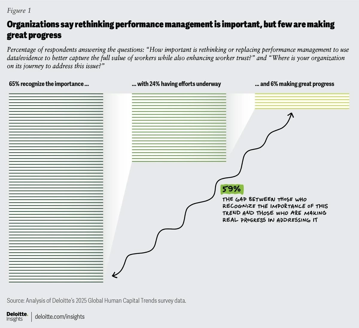 첫 번째 이미지는 성과관리에 대한 인식과 현실 사이의 간극을 보여줍니다. 65%의 조직이 성과관리 재정립이 매우 중요하다고 인식하고 있습니다. 대부분의 리더가 현재 방식에 문제가 있음을 명확히 인식하고 있다는 뜻입니다. 그러나 실제로 개선 노력을 진행 중인 조직은 24%, 의미 있는 성과를 내고 있는 조직은 6%에 불과합니다.