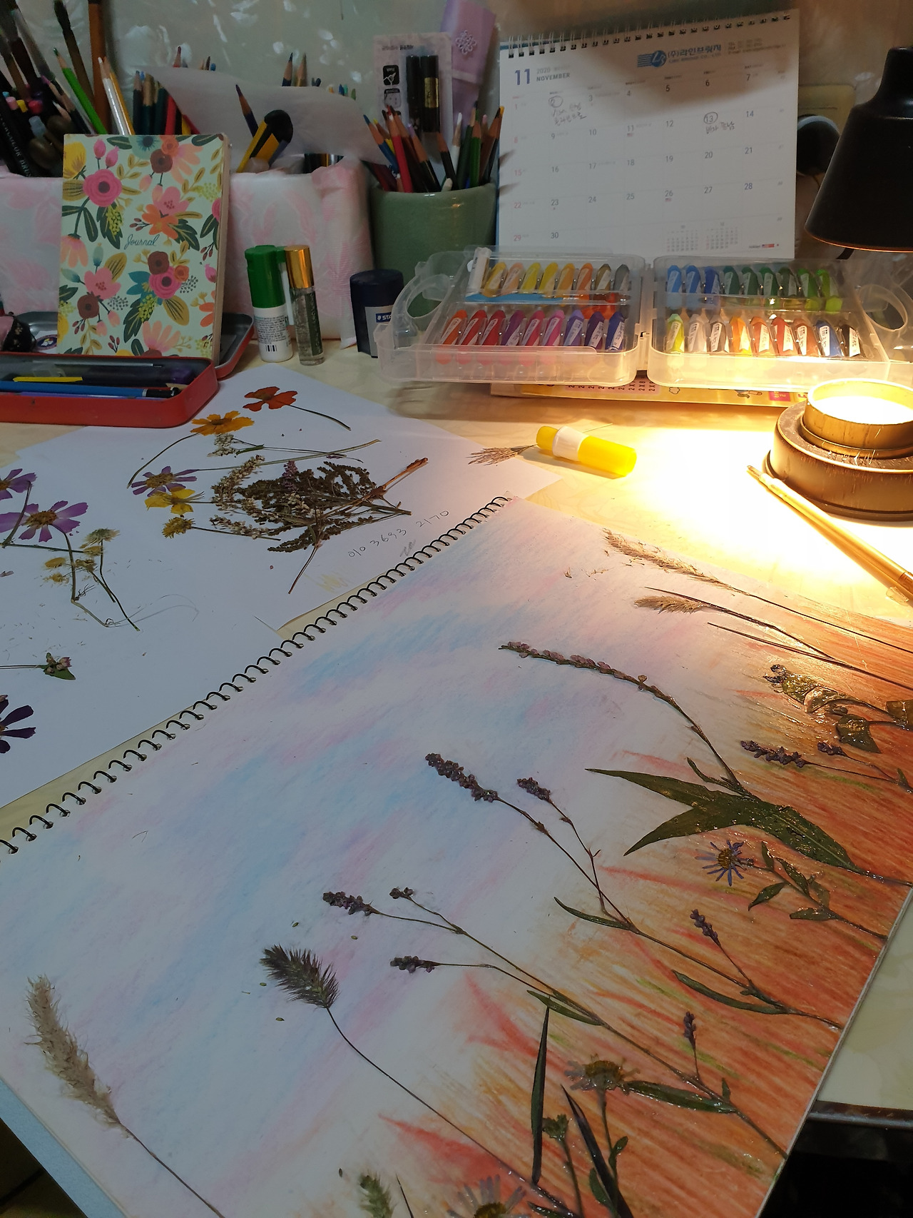 '핑계 없는 무덤 없다'라고 아주 이기적인 핑계를 가지고 있었습니다. 들판으로 아침 산책을 다니며 한국 가을의 아름다움에 매혹되어서, 꽃들이 너무 예뻐서 그만 고의적으로 딱 한 송이씩만 꺾어 책에 넣어 말렸습니다. 저는 가을을 좋아합니다. 어릴 적 소녀 시절부터였던 것 같습니다. 그때 가을에는 단풍잎과 은행잎을 주워 책장에 끼워 말려서 책갈피로 이용했었던 기억이 났습니다. 29년 만에 보는 한국 가을은 너무 아름다웠고, 소녀시절 추억을 떠올리며 다시 한번 해 보고 싶다는 단순한 충동이 일었습니다. 그렇게 고의적인 상해를 꽃들에게, 들꽃에게 가했습니다. 이 죄를 고합니다.