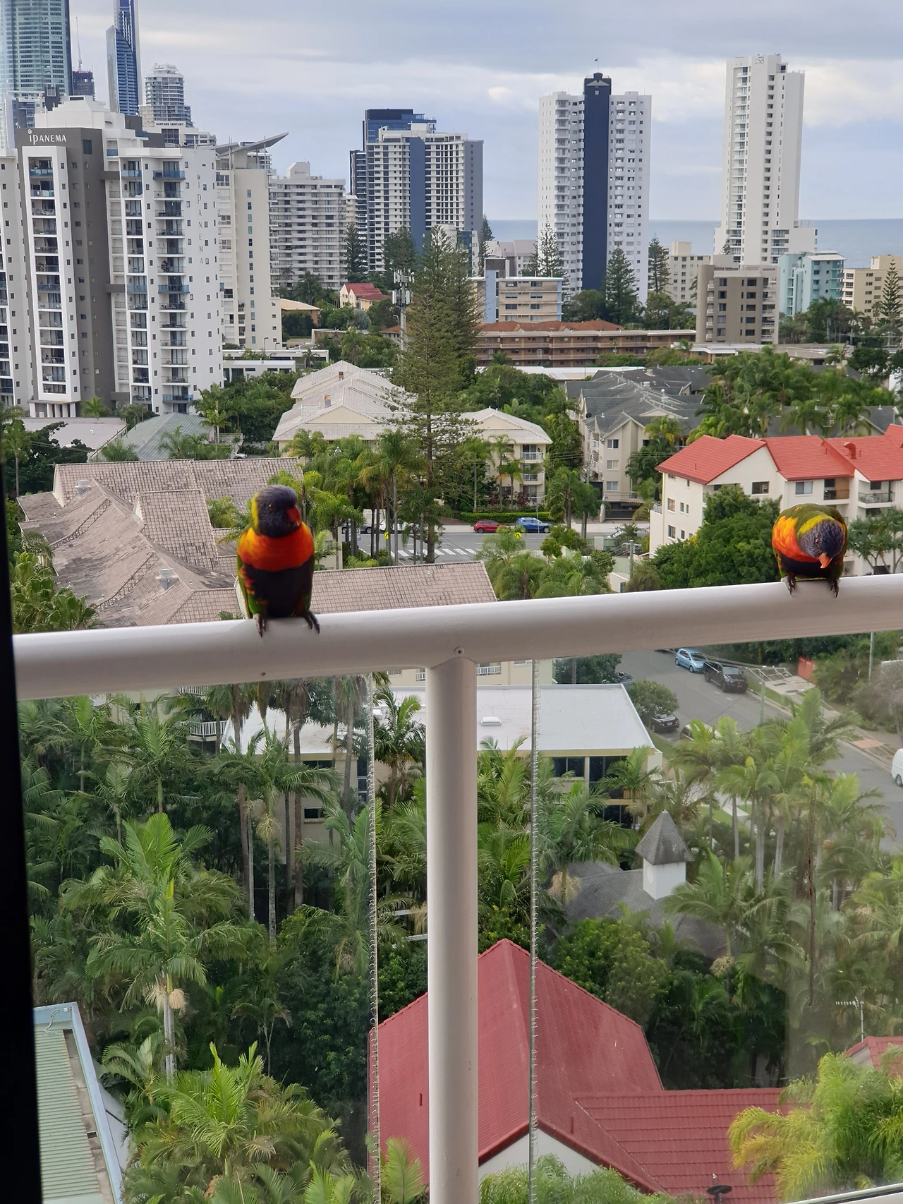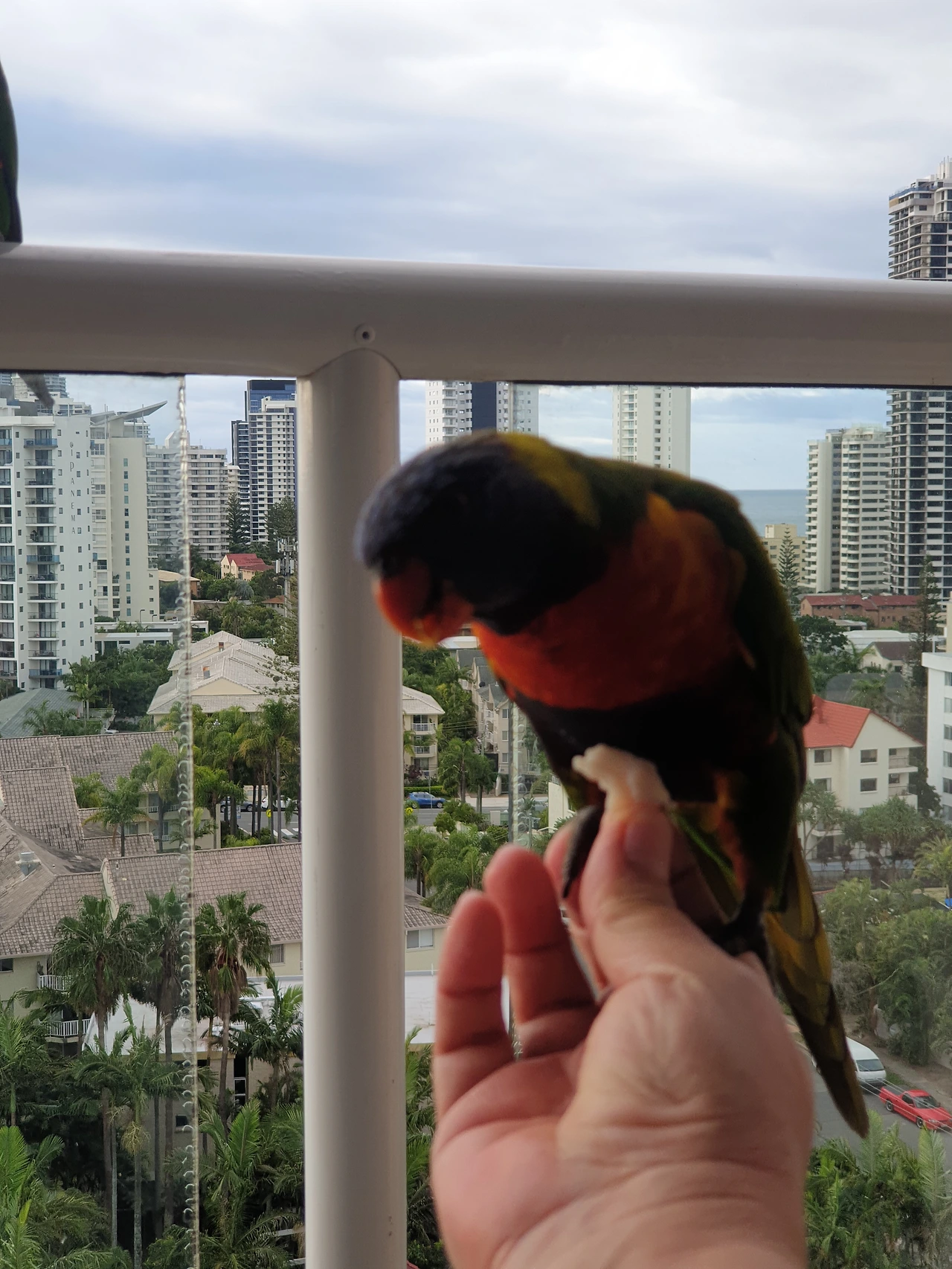 아들과의 짧은 만남을 뒤로하고 발코니에 앉아 있는데 롤리킷 앵무새가 발코니에 찾아와 난간에 앉았다. 먹고 있던 것을 쥔 손을 그대로 내밀었더니 폴짝 내려앉는 나의 먹거리를 살펴보는 녀석의 용감함에 손을 내민 내가 적잖이 놀라 가슴이 뛰었다. 동물을 좋아하지만 새는 지켜보는 정도만 좋아했기에 겁이 났다. 그러면서 손을 내민 나의 객기와 거기에 날아와 앉는 앵무새의 용기에 겁이 났다. 손가락에 느껴지는 까칠한 발톱을 지닌 녀석의 행동은 사람 손에 꽤나 익숙하게 앉아본 경험 새인 듯 한동안 날아가지 않고 나를 바라보았기에 앉았기에 내가 먼저 겁에 움찔하는 바람에 앵무새가 훌쩍 날아가 버렸다. 날아가는 앵무새를 보며 웃음이 나왔다. 내일부터는 찾아와도 절대 손은 내밀지 말아야겠다고 다짐했다.