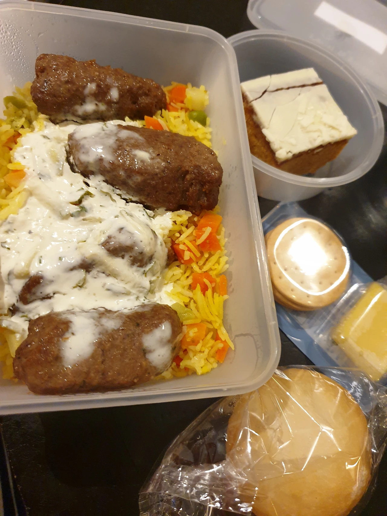 저녁으로 배달된 음식은 그리스식이나 아랍 음식으로 사워크림 소스가 올려진 소시지와 볶음밥이었다. 한국을 떠나는 날부터 5일 만에 처음 보는 밥이라 욕심내어 조금 많이 먹었다. 역시 한국 사람은 밥심인가, 빵보다는 원래 밥을 좋아하는 나라서 입안에 들어오는 밥의 식감은 다르지만 저녁을 먹는 내내 즐거웠다.