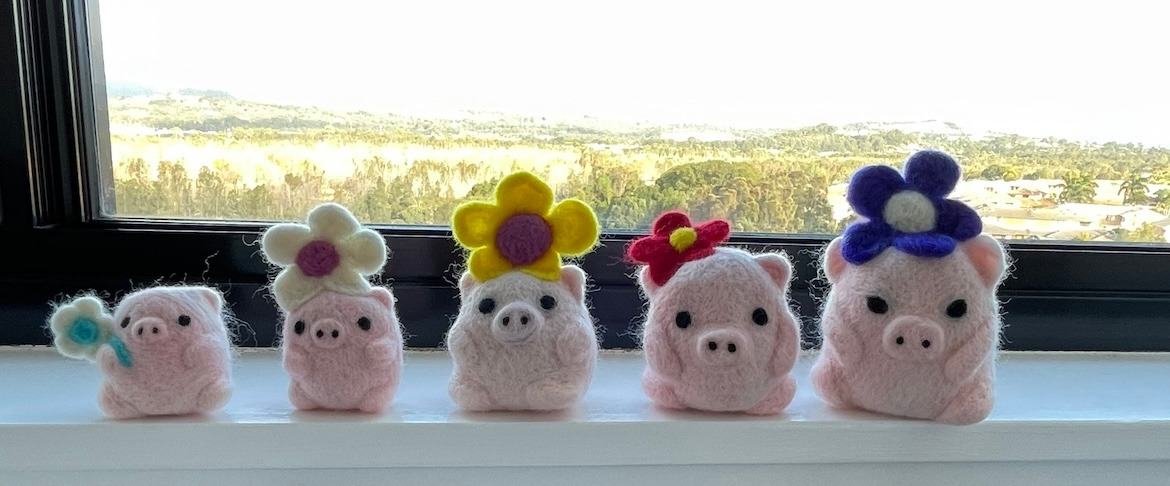 전날 만들었던 머리에 꽃을 올린 핑크 돼지가 너무 귀여워서 우리 가족처럼 아기돼지 오 형제를 만들 생각을 하고 다음날 아침 산책 후 커피 한잔 들고 시작해서 배가 고파서 한번 멈추고 돼지 네 마리를 만들었다. 그날은 하루 한 끼 식사를 했고 커피와 티를 세 번 만들어서 처음 한두 모금 마시고는 식어 버렸다. 아침부터 밤까지 거의 12시간을 바늘 펠팅에만 집중했던 하루였다. 밥 먹는 것도 잊을 정도로 할 일인가 싶지만 다섯 마리를 만들겠다는 생각으로 하나씩 만들다 보니 재미도 있고 귀엽기도 해서 그런지 한번 배가 고파서 뭔가를 찾아 먹기 위해 멈췄지만 시간 가는 줄도 모르고 집중되는 마치 명상 같은 조용한 취미생활이라는 생각이 든다.