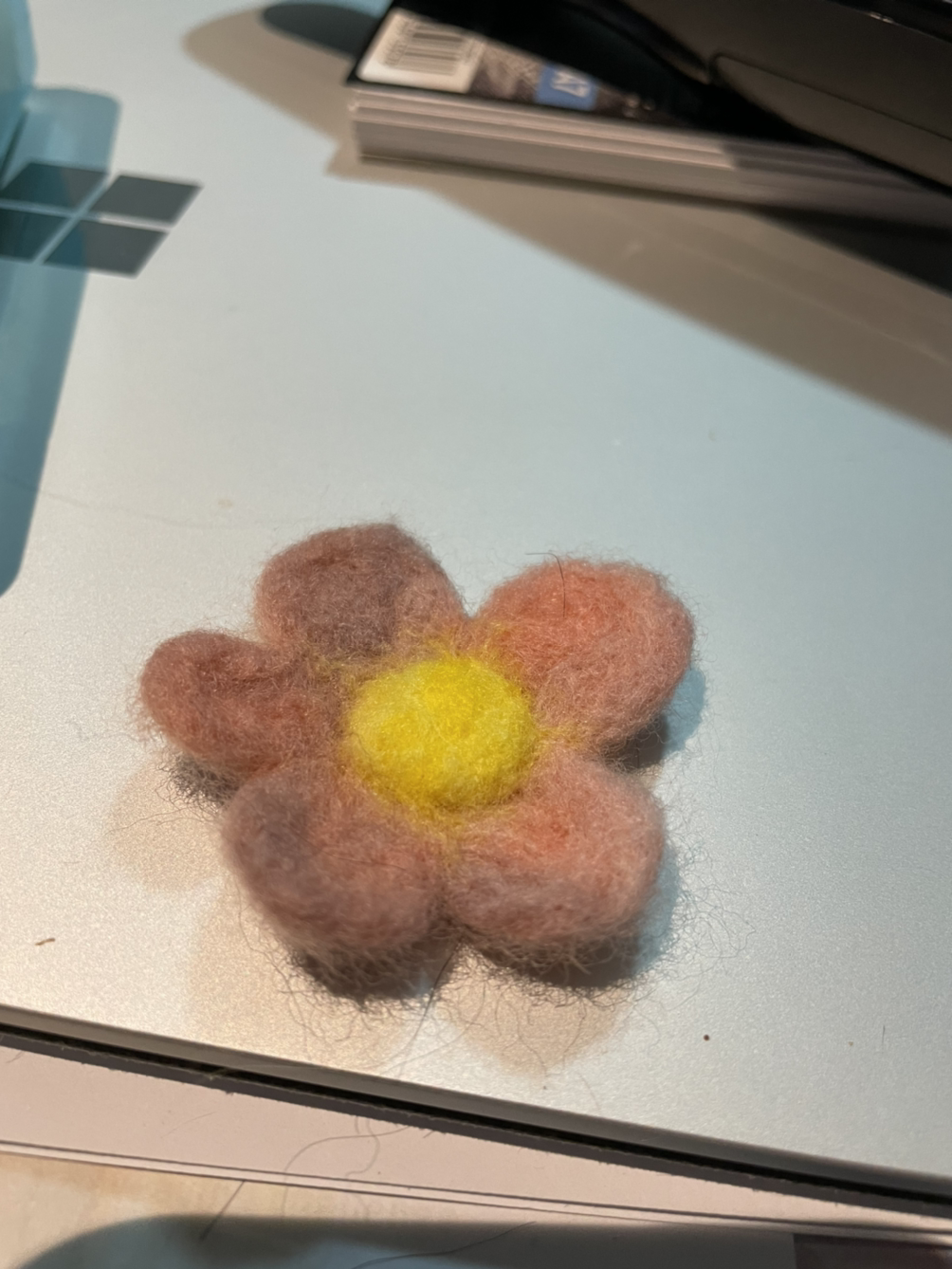 바늘 펠팅은 첫 연습용으로 꽃을 만들어보았다. 가방 만들 때처럼 꽃잎 한 장씩을 양털로 대충 만들어 모양을 만들어 놓고 바늘로 찔러 모양을 단단히 굳혀 꽃 한 송이 만들어 냈다. 바늘 펠팅 연습용이라 예쁘게 보이진 않았지만 꽃 만드는 원리는 알게 되었다.
