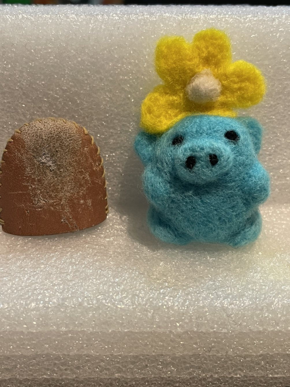 핑크 돼지 오 형제를 만들고 그날 저녁 파란 돼지 한 마리를 더 만들었다. 얼마나 작은 사이즈까지 만들 수 있나 실험해보면서 돼지 중에 가장 적은 사이즈로 만들어보니 손가락에 낀 골무 사이즈와 같았다. 손가락에 골무를 끼고 하면 도움은 되지만 하다 보면 골무 낀 손가락이 불편해 잘 쓰지 않게 되고 골무를 끼지 않은 손가락을 사용하게 되니 다른 손가락이 바늘에 찔렸다. 그래서 정말 조심해서 신경을 써야 했지만 하다 보니 손가락 찔리는 것은 참을만해졌다.