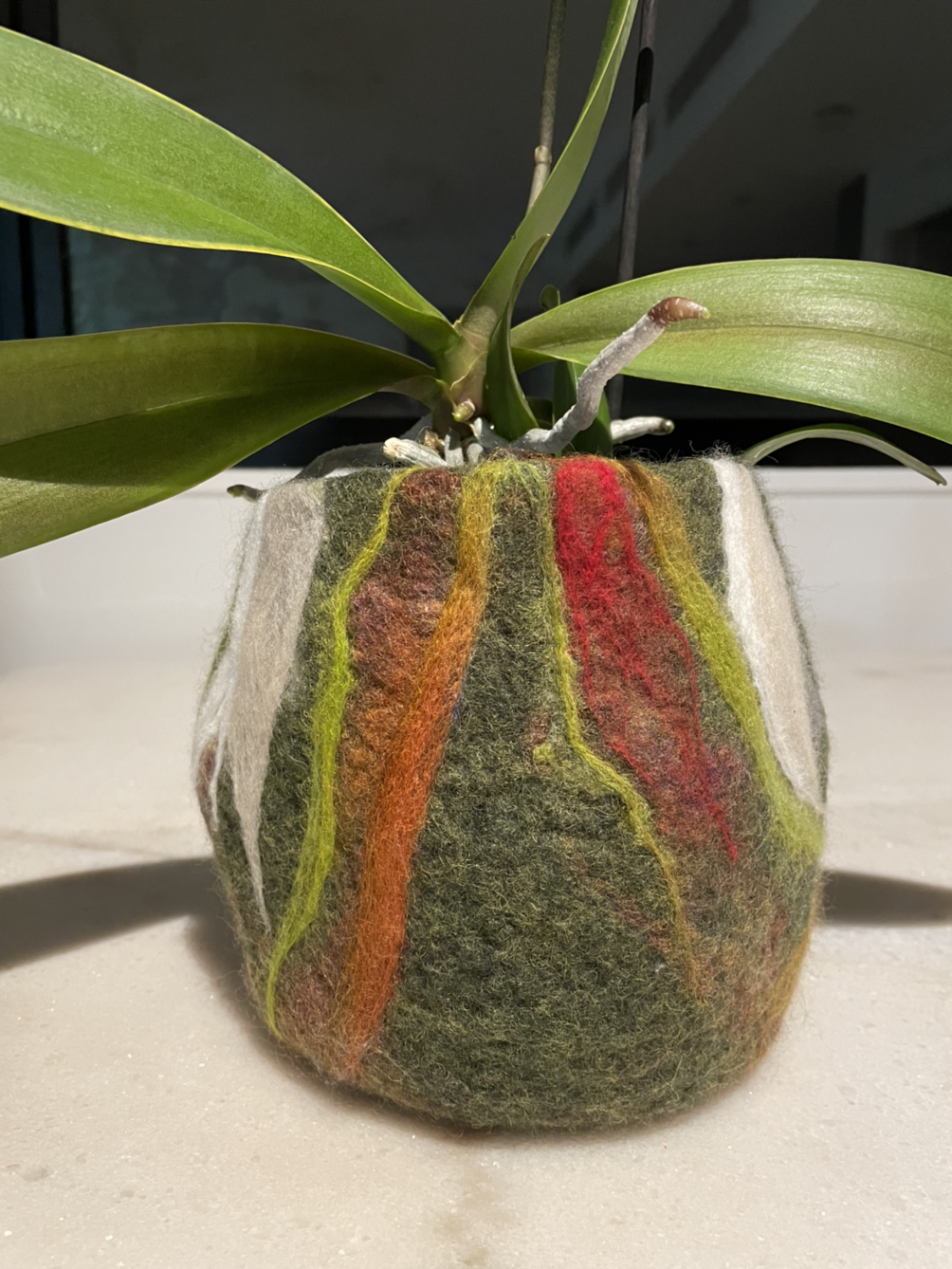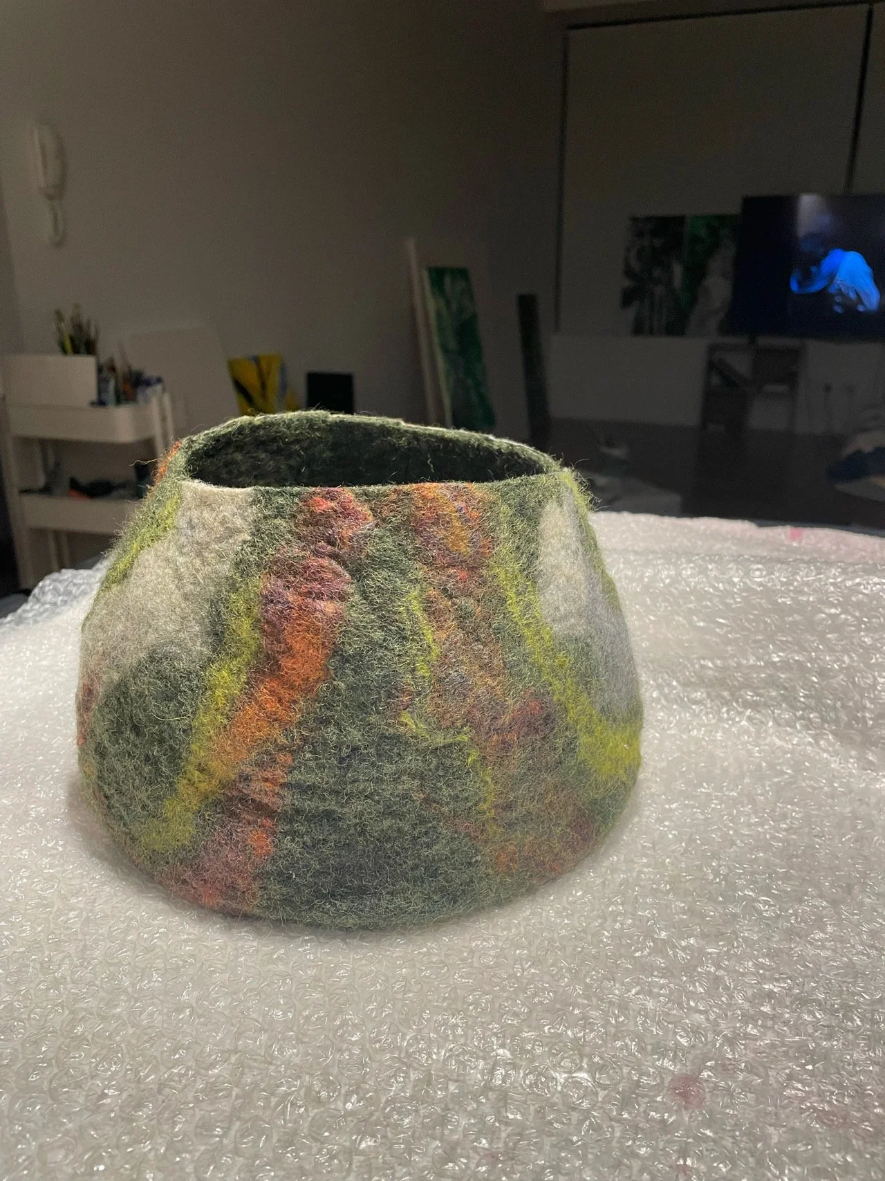 돼지 형제들을 만들고 난 후 며칠 동안 나는 코끼리와 기린도 만들었다. 이렇게 바늘 펠팅으로 만들어본 인형은 충분했다. 이번에는 바늘 펠팅을 Wet felting 작품에 이용해 보기로 했다. 그래서 웻 펠팅으로 만든 그릇 위에 선명한 양털을 위에 올려 바늘로 펠팅 하며 선을 살려보았다. 웻 펠팅에 바늘 펠팅을 추가시키니 느낌이 달라졌다. 어울리며 부드러웠던 웻 펠팅에 니들 펠팅을 입히니 단단하고 정리된 차가움이 느껴졌다. 앞으로는 웻 펠팅과 니들 펠팅을 적절히 섞어서 뭔가를 만들어 볼 생각이다.