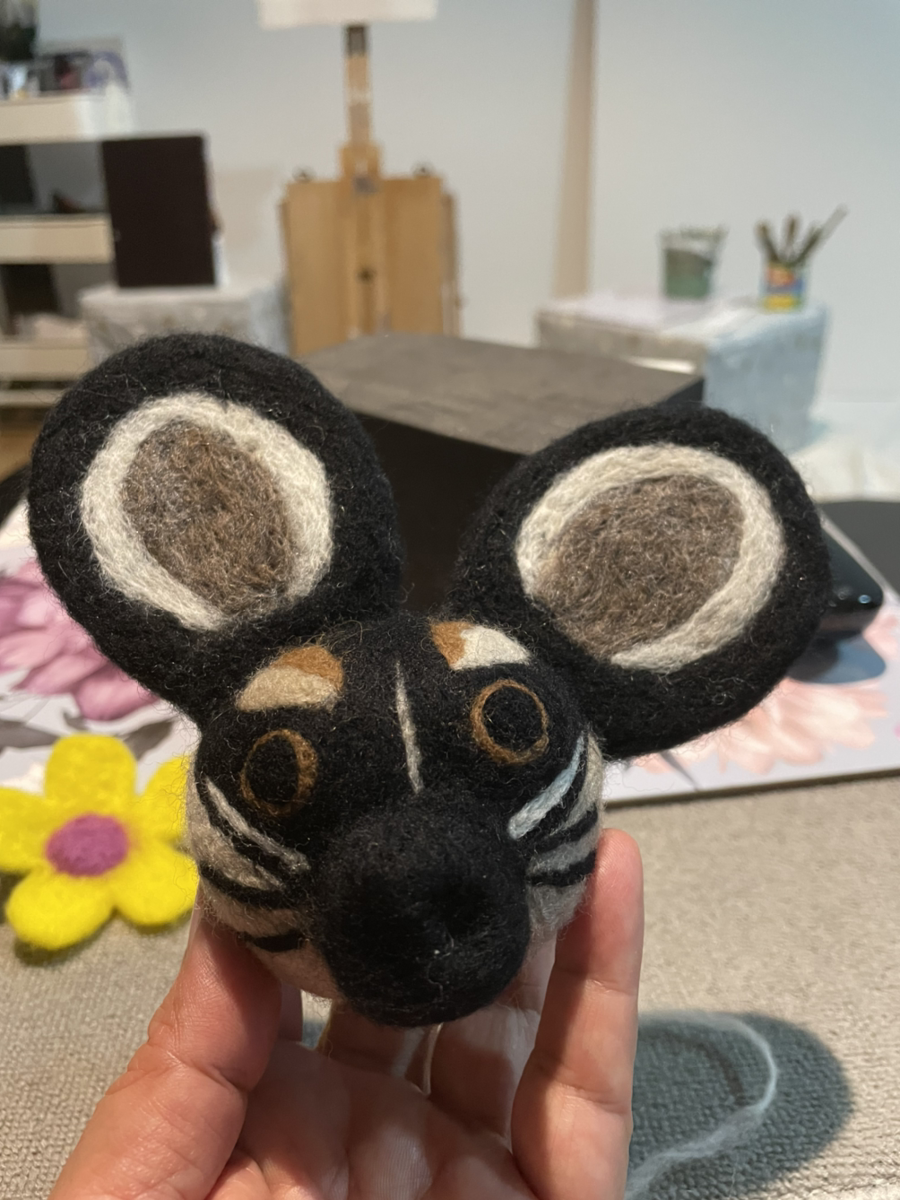 그런 후 인형에 도전하면서 우리 집 강아지를 만들어 보려고 쿠션 속을 뭉쳐서 얼굴 모형을 만들었지만 덩그러니 얼굴만 만들면 괜히 무서울 것 같다는 생각에 길쭉한 얼굴 생김새 모형을 둥근 모양으로 바꾸었다. 동그랗게 얼굴 모형을 만들고 그 위에 양털을 여러 겹 올려가며 우리 집 강아지 얼굴 무늬를 따라 만들었고 둥근 큰 귀를 달아서 귀여움을 주려고 노력했다. 그래서 우리 집 강아지 무늬를 하고 있는 동물 얼굴을 만들어냈지만 종을 모르는 동물로 나의 망설임이 잘 보이는 첫 번째 바늘 펠팅 인형이 만들어졌다.