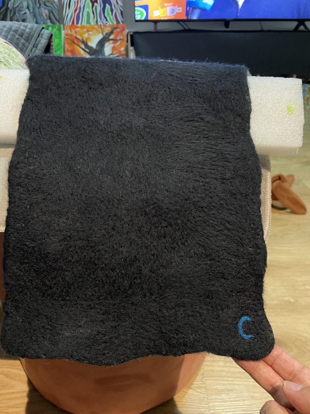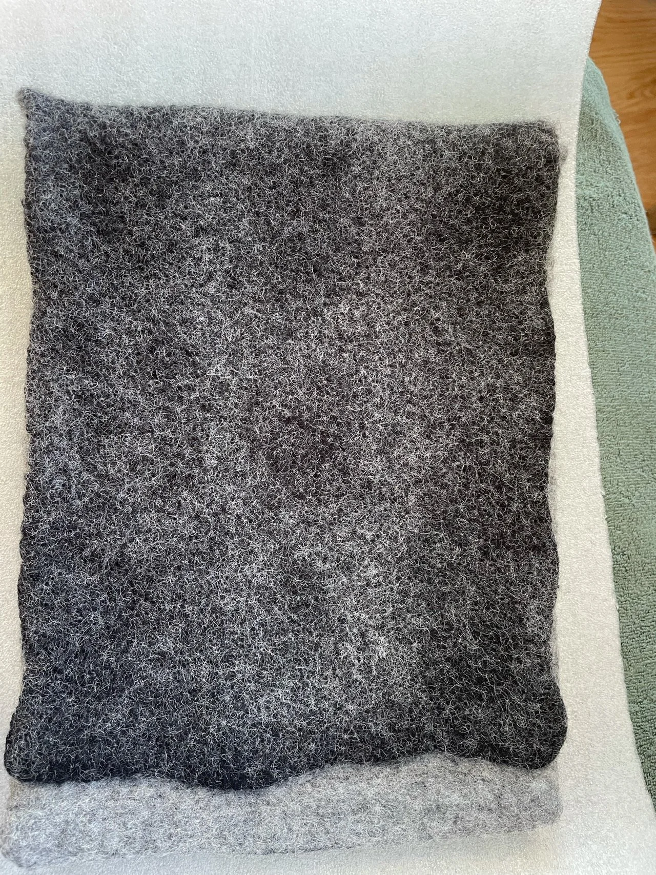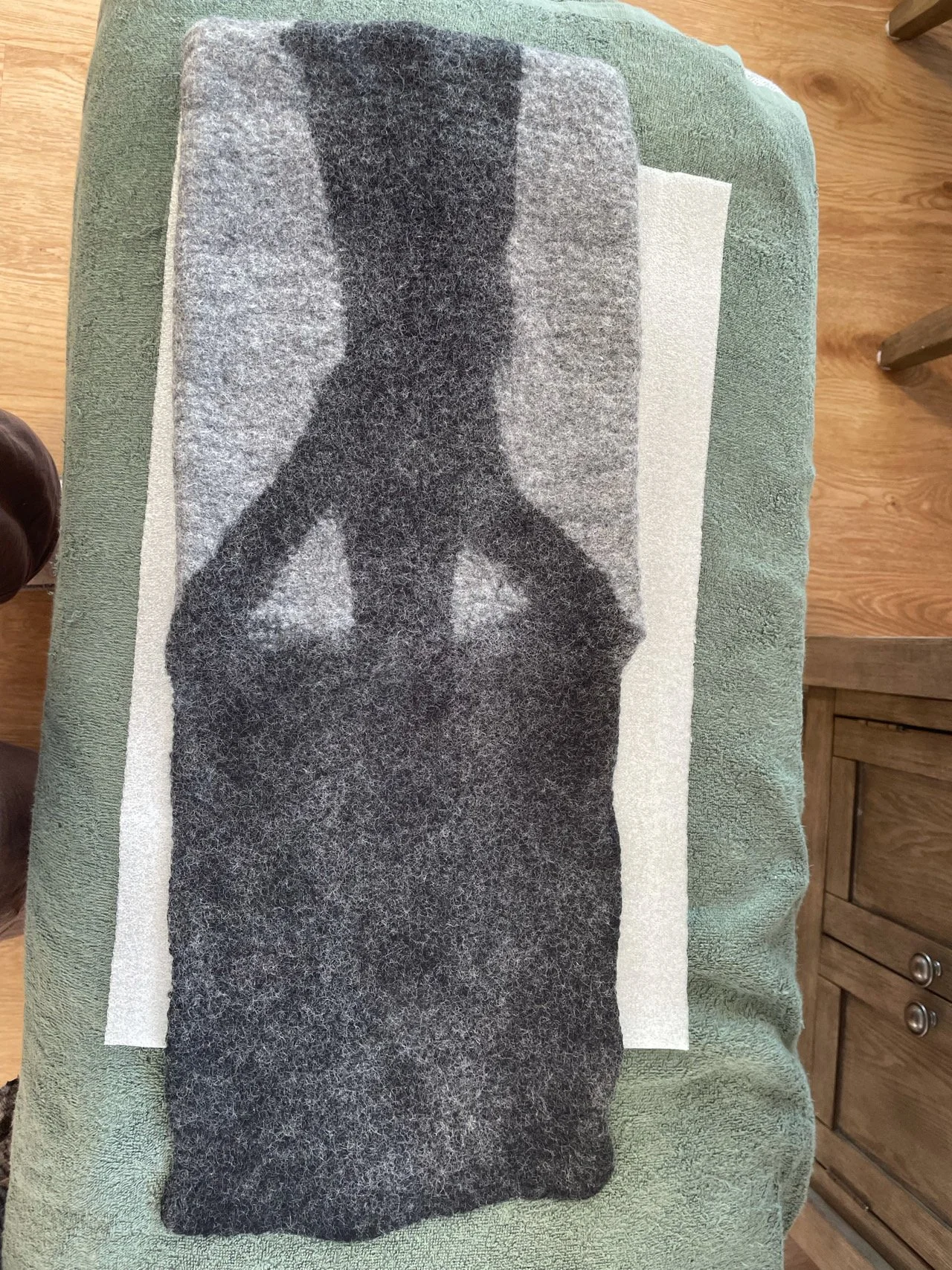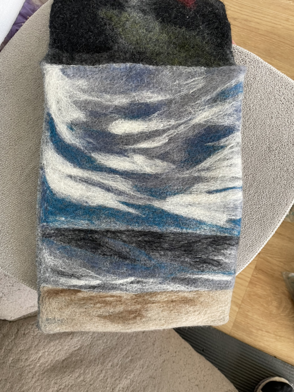 다음날 나는 가방 만들었던 경험을 바탕으로 간단하게 생각하고 모형을 만들었다. 아들의 노트북 크기와 똑같은 나의 아이패드 사이즈에 펠팅으로 줄어들 사십 퍼센트를 포함시켜 크게 모형을 만들어서 바로 웻 펠팅을 시작했고 노트북 케이스 모양을 만들어내는데 4시간 정도가 걸렸다. 케이스 덮게선이 깔끔한 직선으로 나오지 않아서 가위로 잘라 선을 정리할까 생각도 했지만 핸드메이드의 멋이라 생각해서 자연스럽게 나온 선을 그대로 두었다.