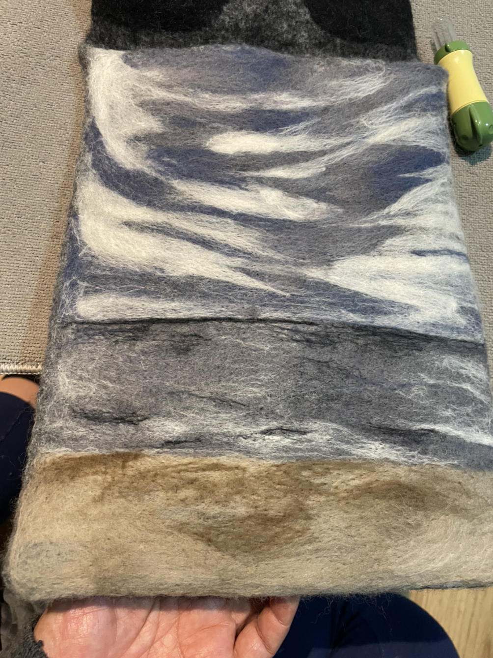 웻 펠팅 한 노트북 케이스는 말려지는데 3일 정도가 걸렸다. 완전히 말려진 케이스 위에 바늘 펠팅을 시작해 보니 웻 펠팅은 4시간 정도면 완성되었는데 바늘 펠팅은 특히 그림을 새겨 넣는 작업은 끝을 예측할 수 없었다.