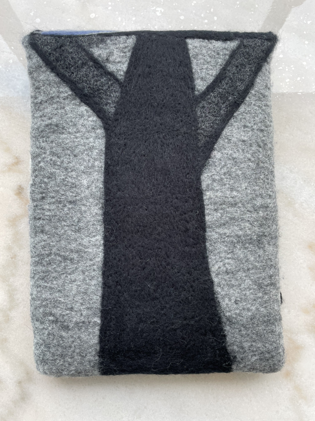 웻 펠팅으로 만들어진 노트북 케이스를 말리는 동안 혹시 줄어들 것을 예방하는 차원에서 나의 아이패트를 넣고 틀을 잡았다. 웻 펠팅으로 만들어진 케이스가 마르면 바늘 펠팅으로 내가 그린 그림들을 케이스 장식으로 넣어 볼 계획을 세웠다. 그래서 미리 노트북 겉은 아들의 취향 데로 화려하거나 튀지 않은 검은색으로 내가 즐겨 그리는 큰 나무로 무늬를 넣었고 바늘 펠팅으로 나무와 검은색을 살려 장식할 것이다. 그리고 케이스 뚜껑을 열면 거기에 나의 또 다른 그림인 하늘과 바다 그리고 모래인 땅을 넣어서 그림으로 아들에게 전해주고 싶은 의미는 아름다운 자연과 함께하는 한그루 큰 나무가 되어 아들이 행복하고 건강하게 뻗어가라는 엄마의 마음을 전해주고 싶었다.