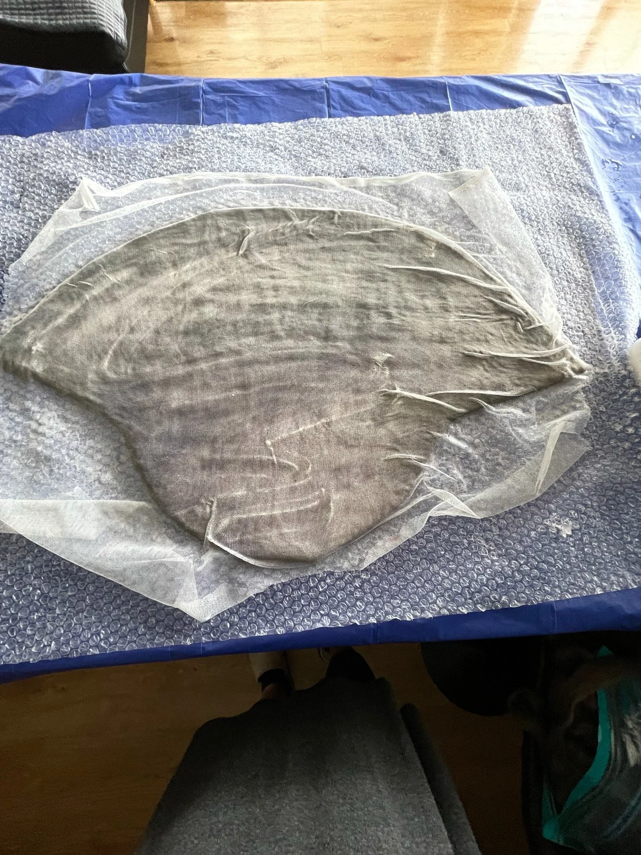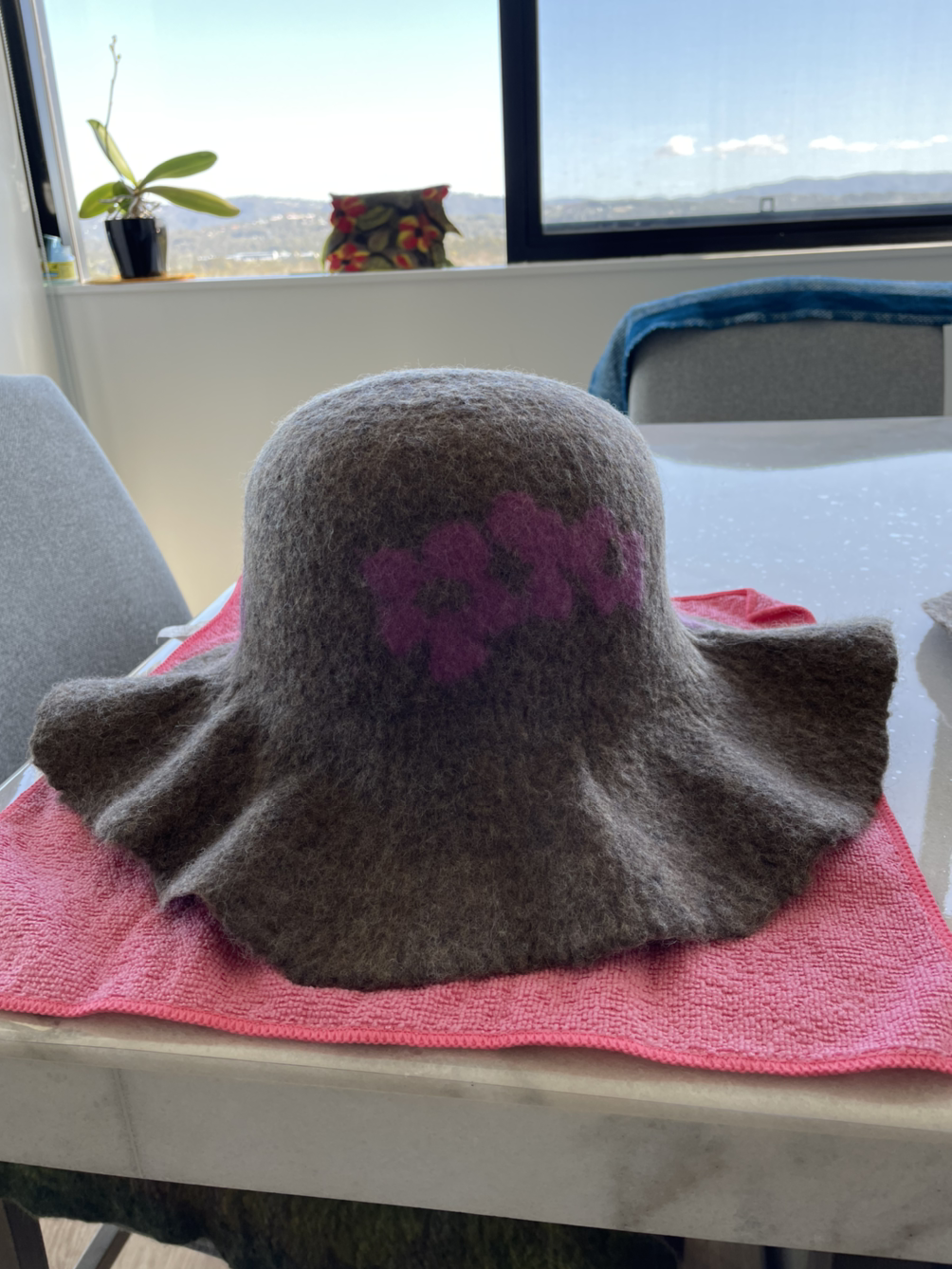 말리기 시작해서 3일 만에 건조된 모자를 써보니 머리에 쓰는 부분이 좀 더 깊으면 좋겠다는 생각이 들었고 어떻게 고쳐야 할지 고민하다 말린 모자를 뜨거운 물에 적셔 펠팅을 다시 했다.