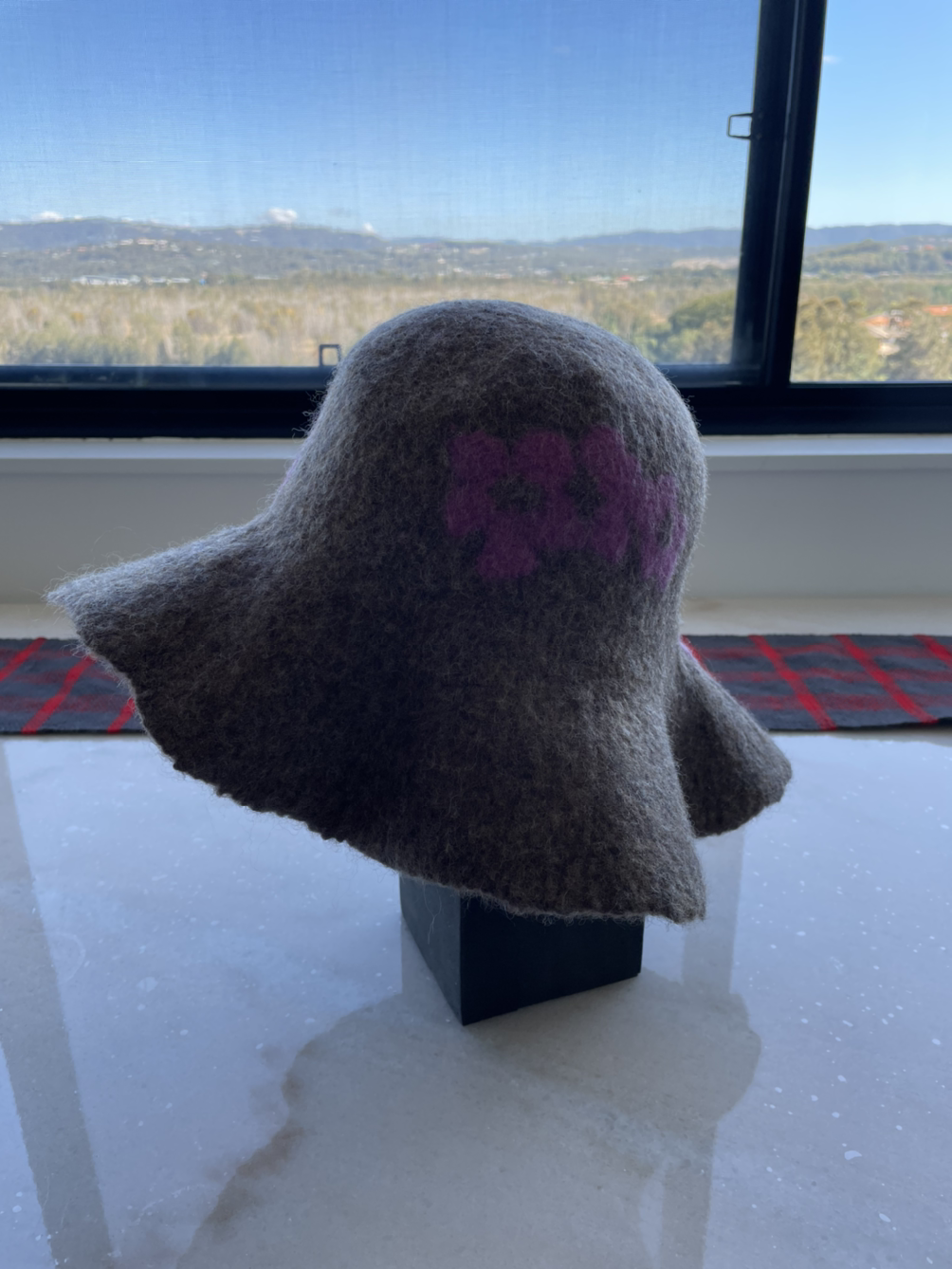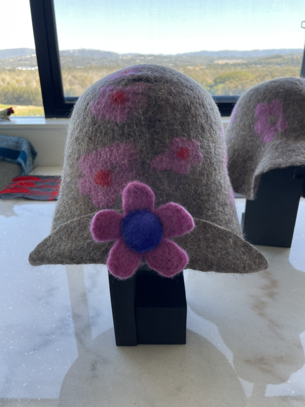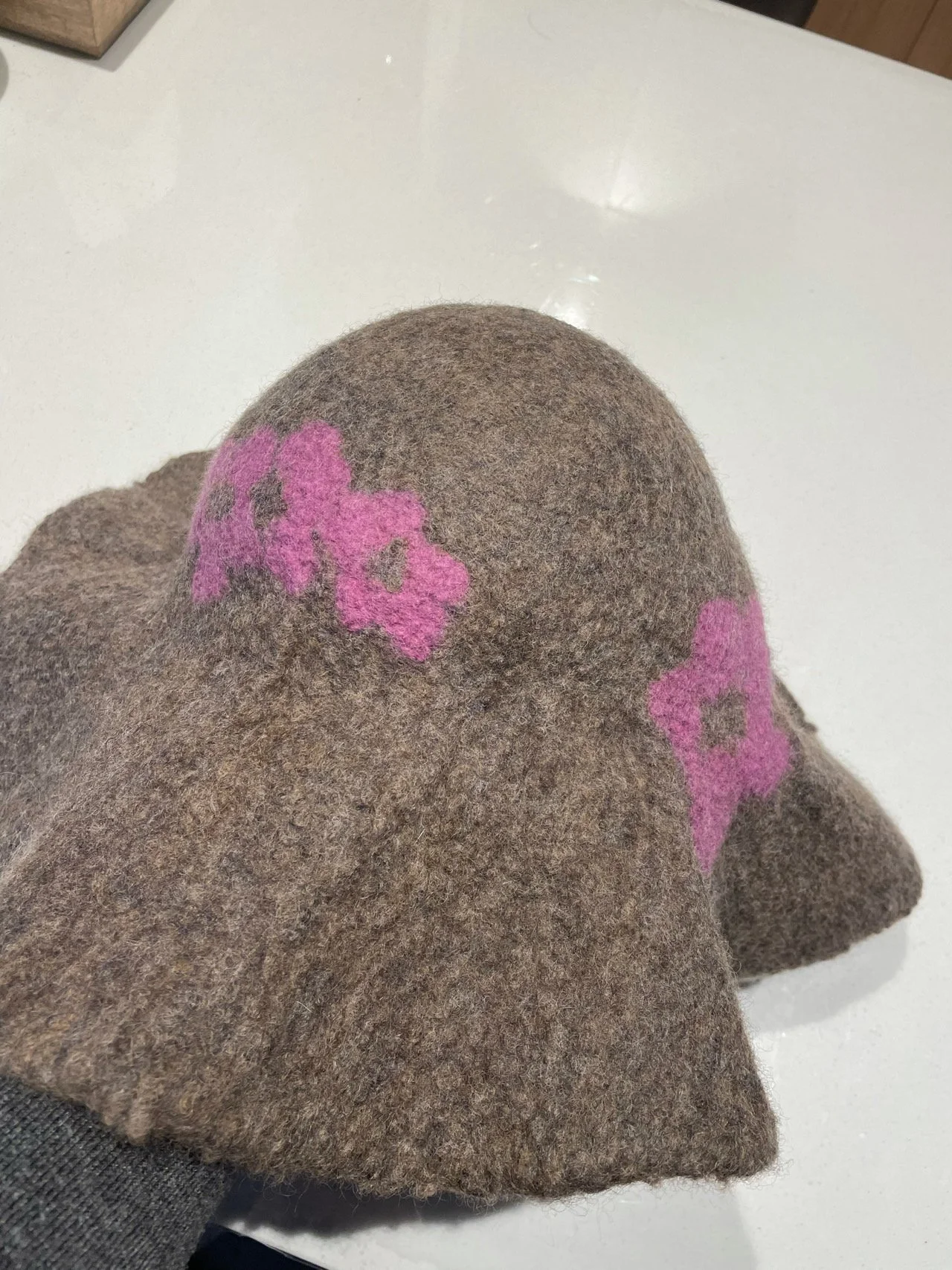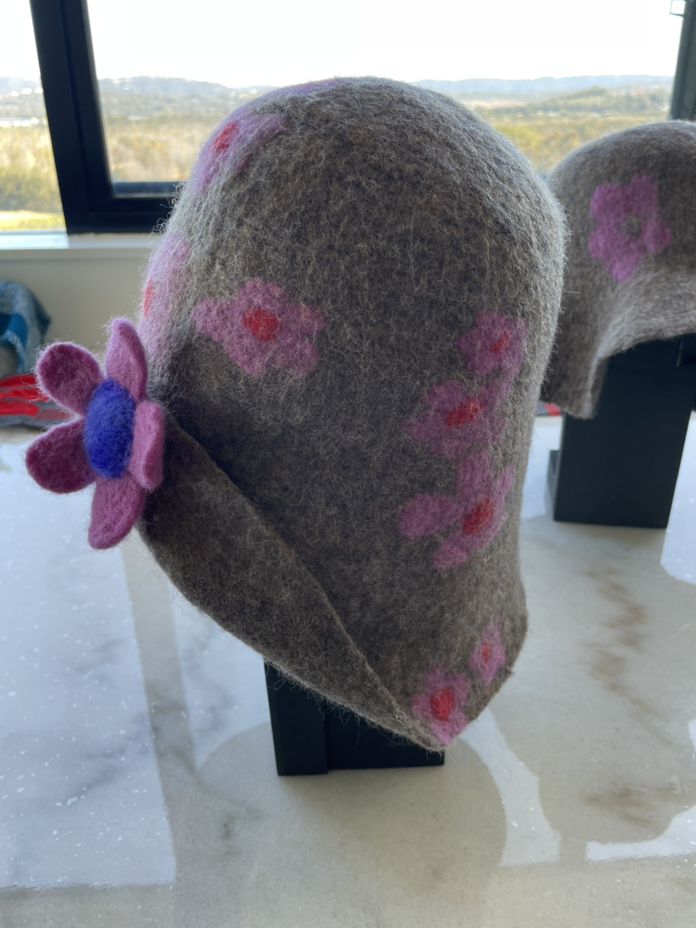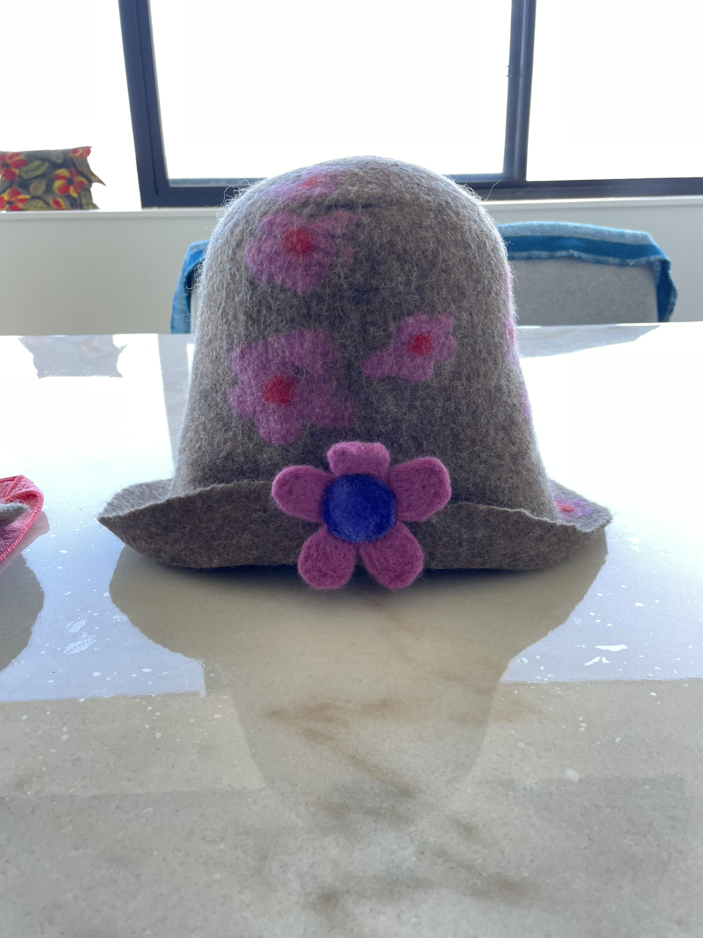 브림 햇의 길이로 했기 때문에 바켓 햇으로 만들어 보니 길이가 너무 길어서 펠팅 한 것이 아까웠지만 잘라내어 길이를 수정했다. 이번 모자는 한국에 계신 엄마에게 드릴 생각으로 만들었고 그래서 바늘 펠팅으로 꽃을 하나 만들어 포인트를 주며 모자 앞을 접어 올려 꽃을 달고 시야도 넓게 했다. 이번 모자는 머리는 물론이고 귀와 목까지 따뜻한 완벽한 겨울용도 모자로 만들어져 추운 한국 겨울에도 따뜻할 것 같아 만들어진 모자를 보면 벌써 마음이 좋아진다.