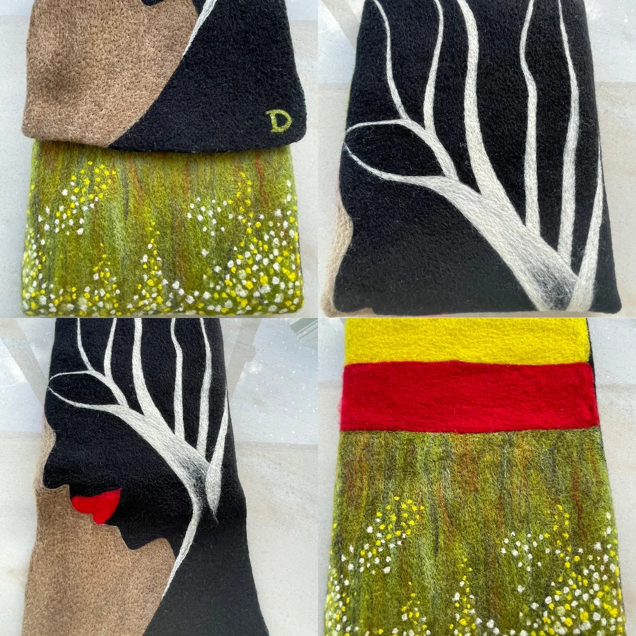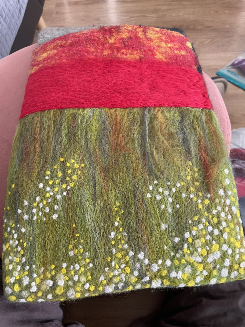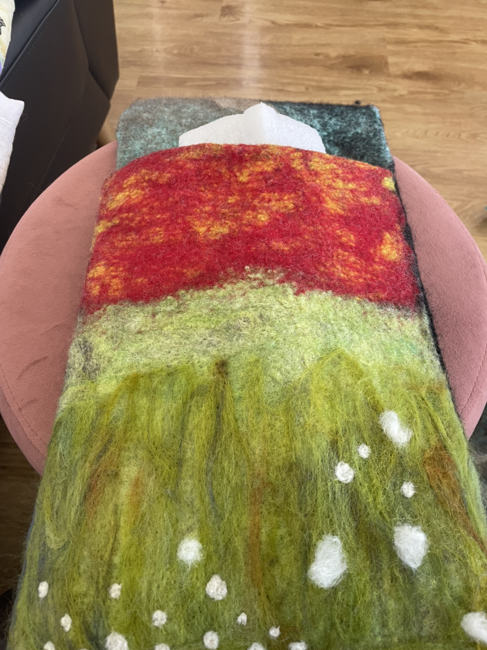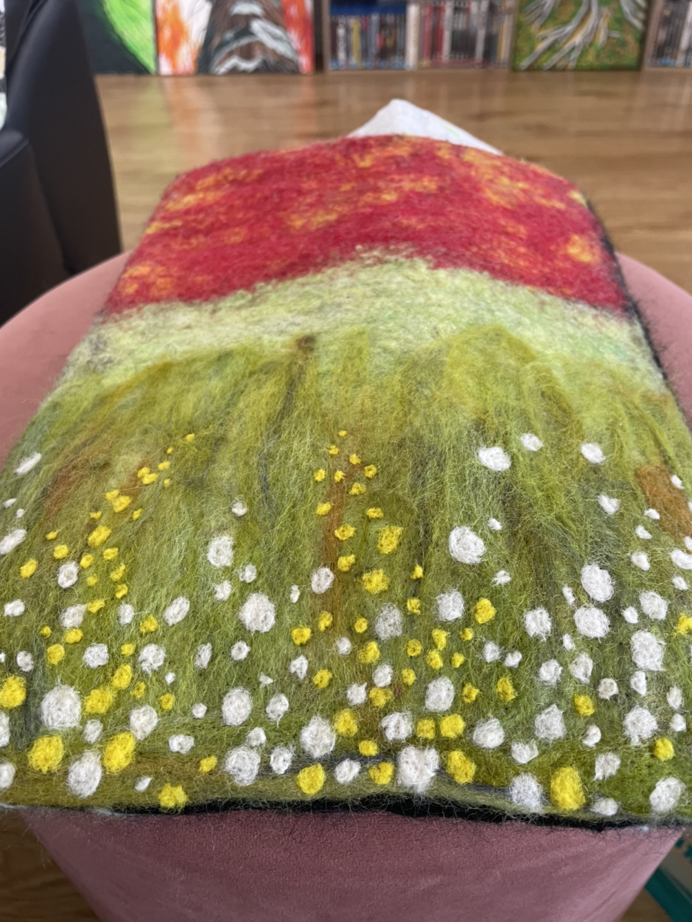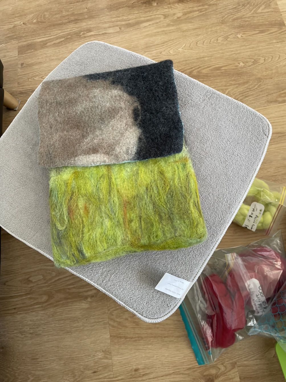 4시간 걸려 웻펠팅으로 모양을 만들어냈고 3일 동안 형태를 잡아가며 말린 후 니들 펠팅으로 나의 아크릴 그림을 넣기 시작했다.