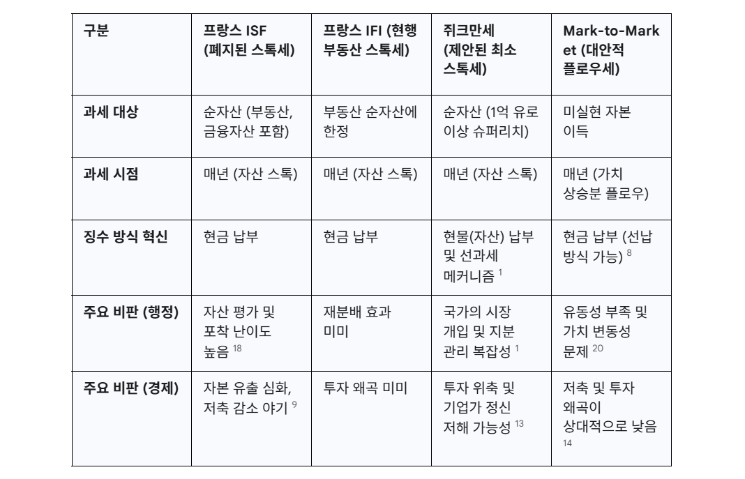 이러한 대안 모델들과 쥐크만세는 기술적으로는 순자산(Stock) 과세와 자본 소득(Flow) 과세로 구분되지만, 모두 궁극적으로는 부의 축적 속도(r>g)를 제어하고 슈퍼리치의 낮은 실효세율 문제를 해결하려는 동일한 정책 목표를 공유한다.3 정책적 선택은 자산 평가의 난이도를 감수하고 스톡에 직접 과세할 것인지, 아니면 행정적으로 더 정교한 플로우 과세 시스템을 구축할 것인지의 역사적 딜레마로 귀결된다.