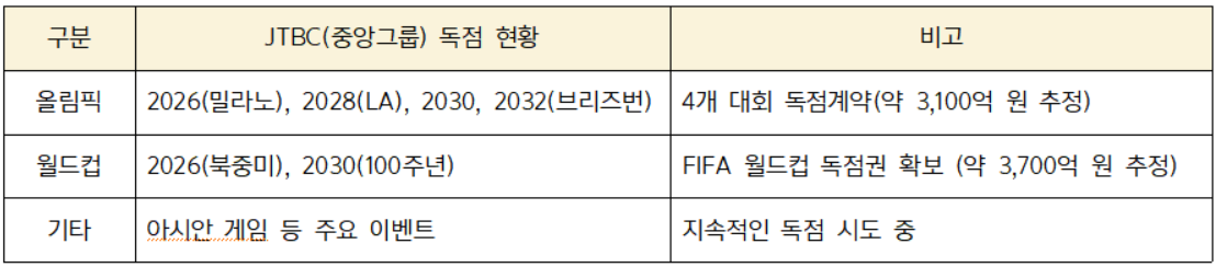 더욱 우려스러운 지점은 국가적 대항전 성격을 띠는 메가 스포츠 이벤트의 독점이다. 중앙그룹 산하의 JTBC는 2026년부터 2032년까지 개최되는 동·하계 올림픽 4개 대회의 한국 중계권을 독점 계약했다. 계약 규모는 약 2억 3,000만 달러(한화 약 3,100억 원)로 추정된다. 또한 2026년 북중미 월드컵과 2030년 월드컵 중계권까지 싹쓸이하며 사실상 국가적 스포츠 이벤트의 '게이트키퍼(Gatekeeper)' 지위를 확보했다. JTBC는 이 독점권을 무기로 지상파 3사(KBS, MBC, SBS)와의 재판매 협상에서 우위를 점하려 하고 있으며, 이는 필연적으로 보편적 시청권 논란을 야기하고 있다.