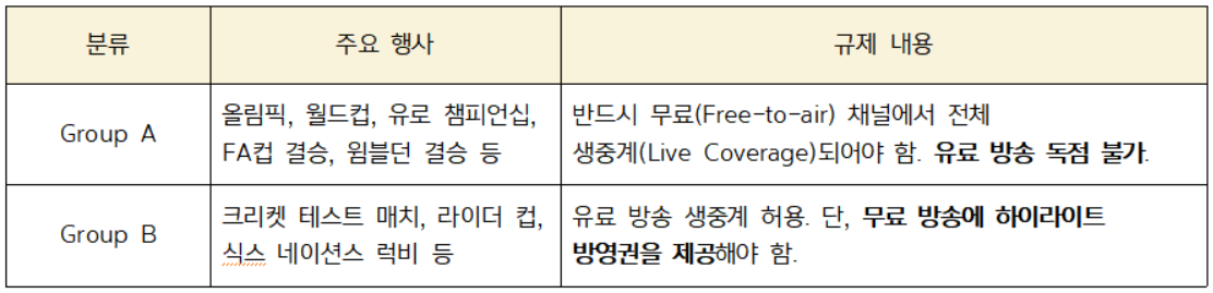 2) '적격 서비스(Qualifying Service)'의 공영성 강화 가장 결정적인 변화는 Group A 이벤트를 중계할 수 있는 '적격 서비스'의 자격을 '공영방송(PSB: Public Service Broadcaster)'으로 한정한 것이다. 기존에는 인구의 95% 도달률만 충족하면 되었기에, 이론적으로는 글로벌 기술 기업이 무료 앱을 배포해 조건을 맞출 수도 있었다. 그러나 개정법은 BBC, ITV, Channel 4, Channel 5 등 명확한 공적 책무를 가진 방송사만이 이 권리를 가질 수 있도록 'PSB-specific benefit(공영방송 특혜)'임을 명문화했다. 이는 자본력은 있지만 공적 책임이 없는 빅테크 기업의 시장 교란을 원천 봉쇄하는 강력한 조치다.