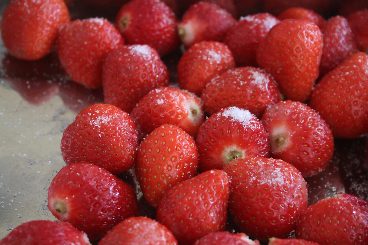 2) 손질된 1)의 딸기를 볼에 넣은 뒤, 설탕 2큰술을 넣고 살살 뒤적여 줍니다.