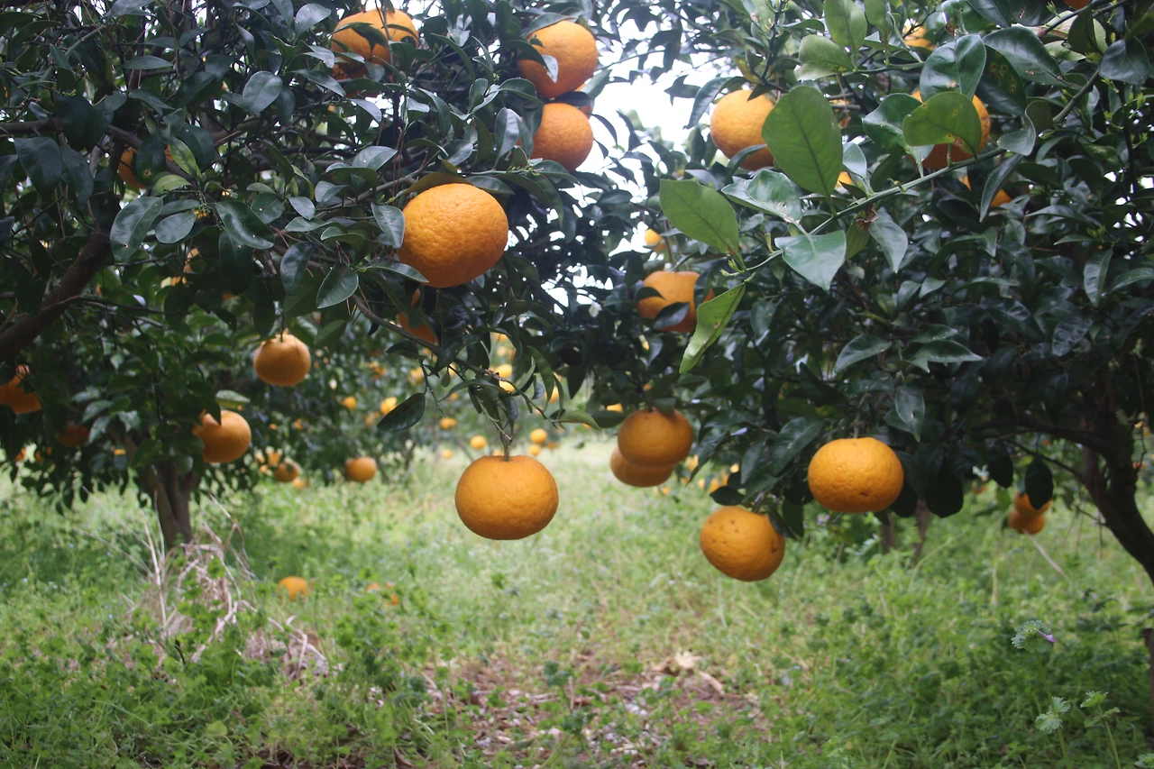 농원에 내리면 저 멀리 보이는 하귤 나무들. 어릴적 라임오렌지나무 삽화에서 보았던 딱 그 나무다. 그런데 인형처럼 나무의 가지 대비 커다란 열매들을 가지마다 가득 얹고 이고, 보기에도 무거워 보인다. 얼른 저 열매들을 내려주고 싶다는 생각이 드는데, 의외로 이 열매들은 태풍이 오지 않는 한 8월까지도 끄떡없이 매달려 있다는 말씀. 그런데 문제는 지난 겨울의 추위였던 모양이다. 밭 한 쪽 구석에는 겨우내 다 크기 전에 추위를 못이기고 떨어진 열매들이 작은 동산을 이루며 노랗게 쌓여 있었다.
