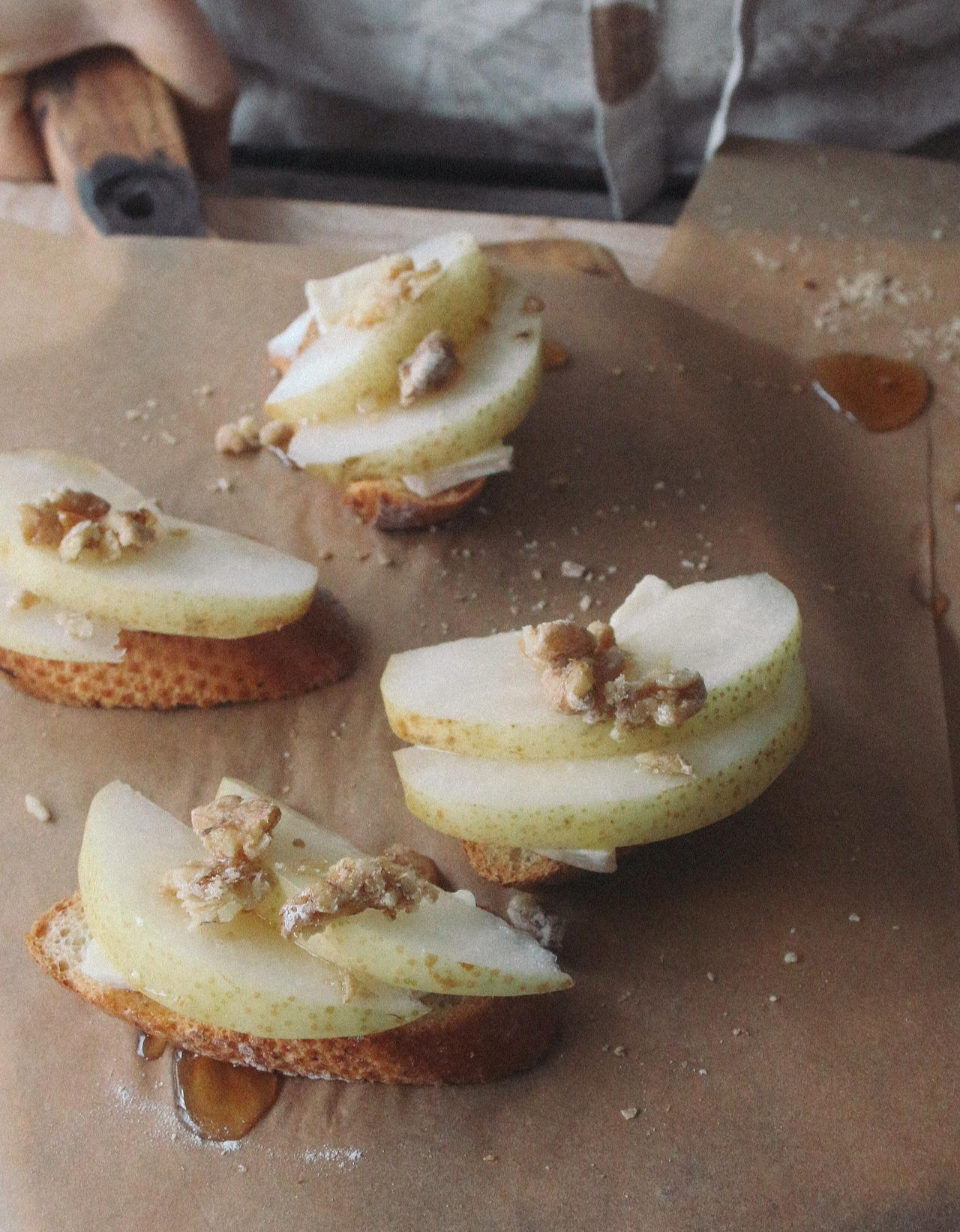4. 구운 바게트 위에 치즈와 배를 차례로 올린다.