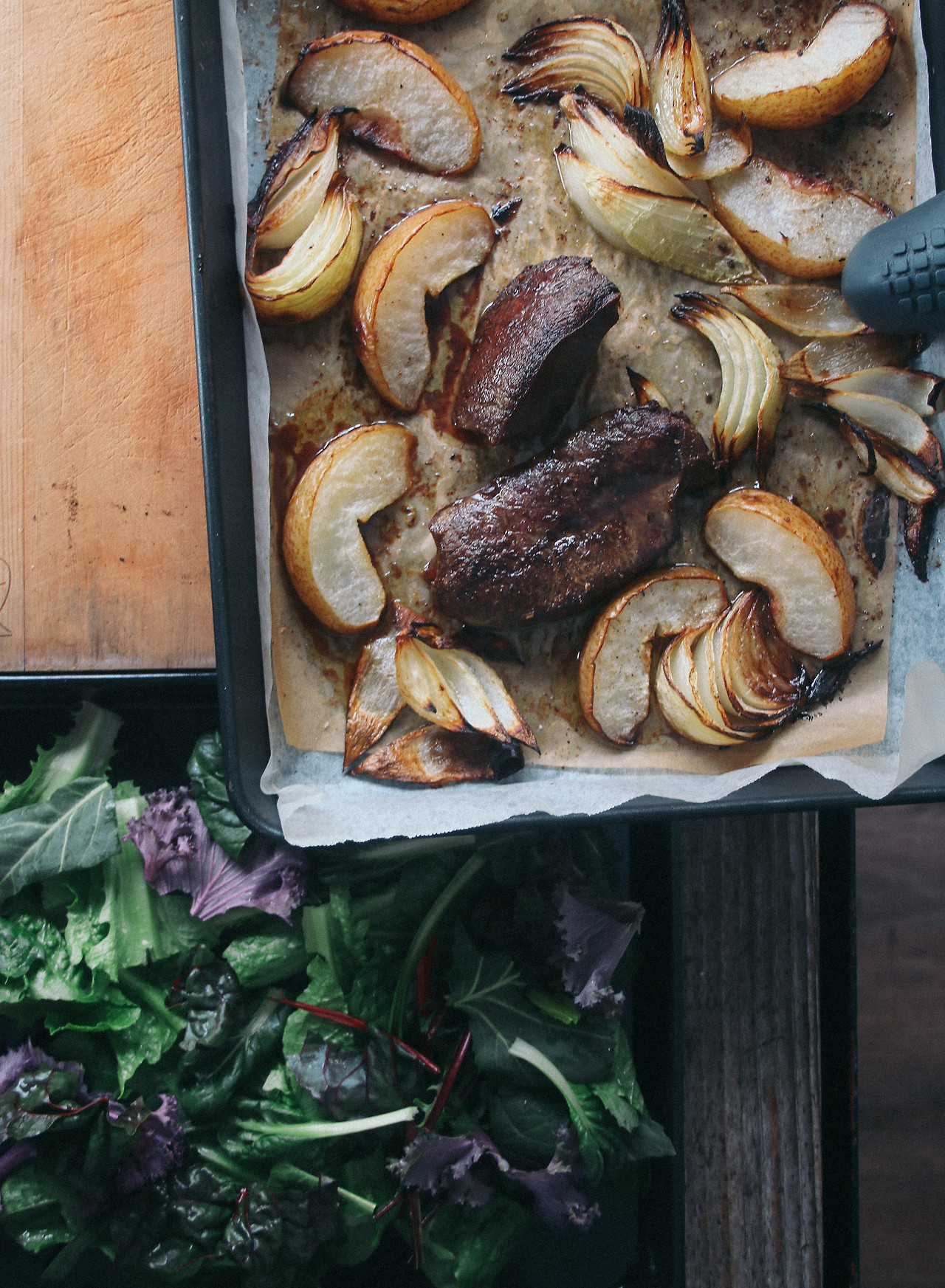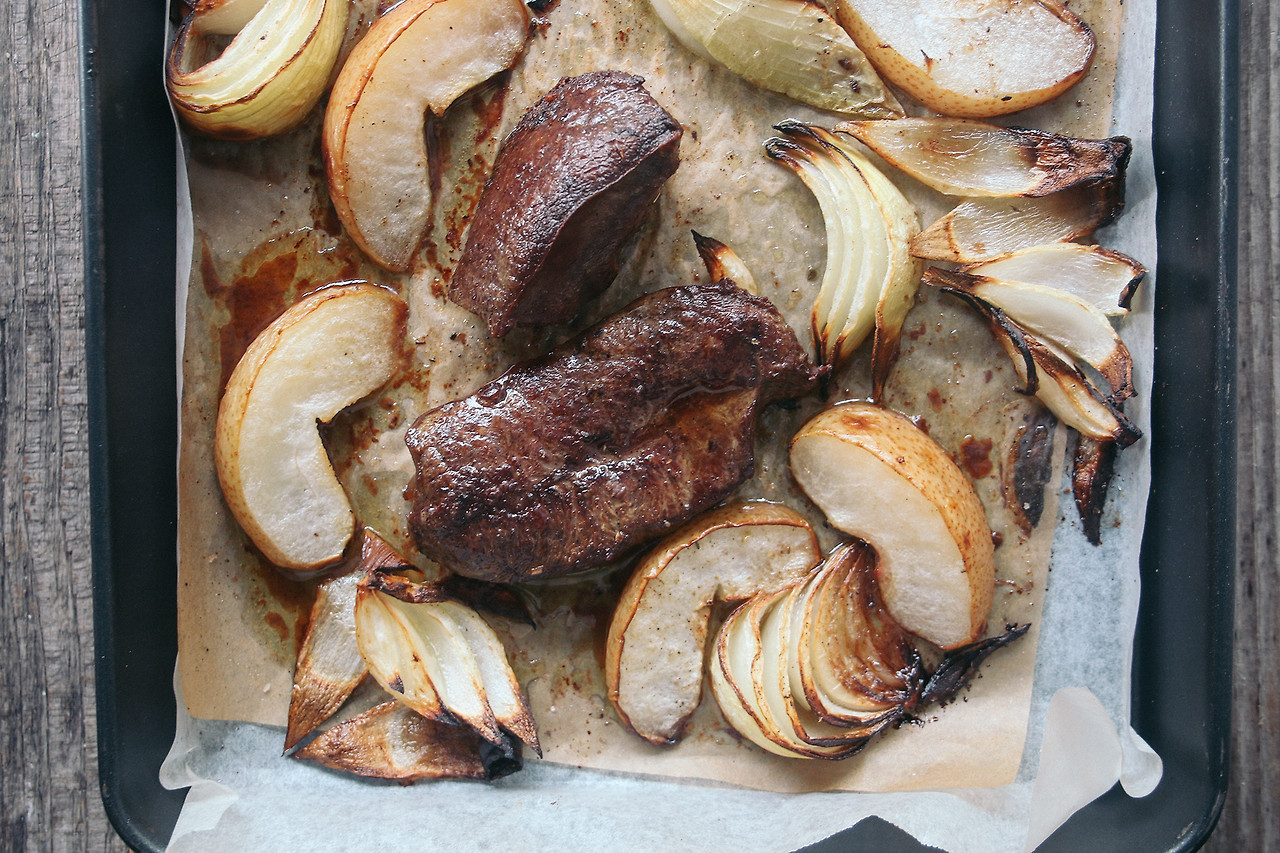 9. 배와 양파가 든 오븐 팬에 스테이크를 올린다.