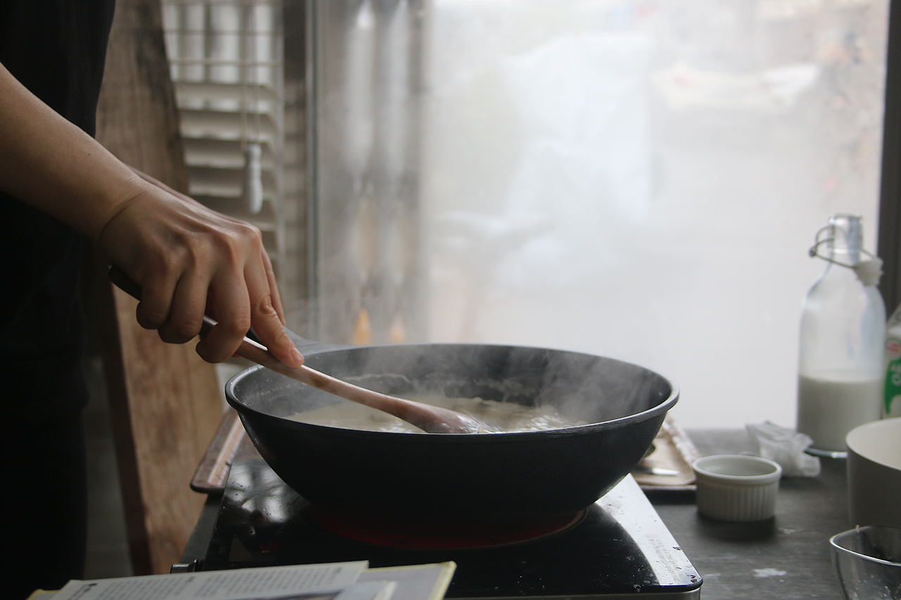 일단 오븐에 불을 올리고 통마늘부터 집어넣었다. 마늘 굽는 냄새가 온 부엌을 채울 때쯤, 후라이팬에는 넉넉한 버터 한 스푼에 잘게 다진 감자와 양파를 볶느라 정신이 없다. 수프에 일일이 루까지 만들기 힘들 땐, 잘 부스러지는 감자와 다진 양파를 좀 더 오래 볶아주면 되니까. 오븐에서 나온 구운 마늘을 까서 넣고 우유와 크림을 부어 끓이기 시작하면 일단 급한 불을 끈 셈. 한참을 푹푹 끓여낼수록 맛의 깊이가 더해지고, 부드러워지다 보니 수프는 생각보다 시간이 걸린다.