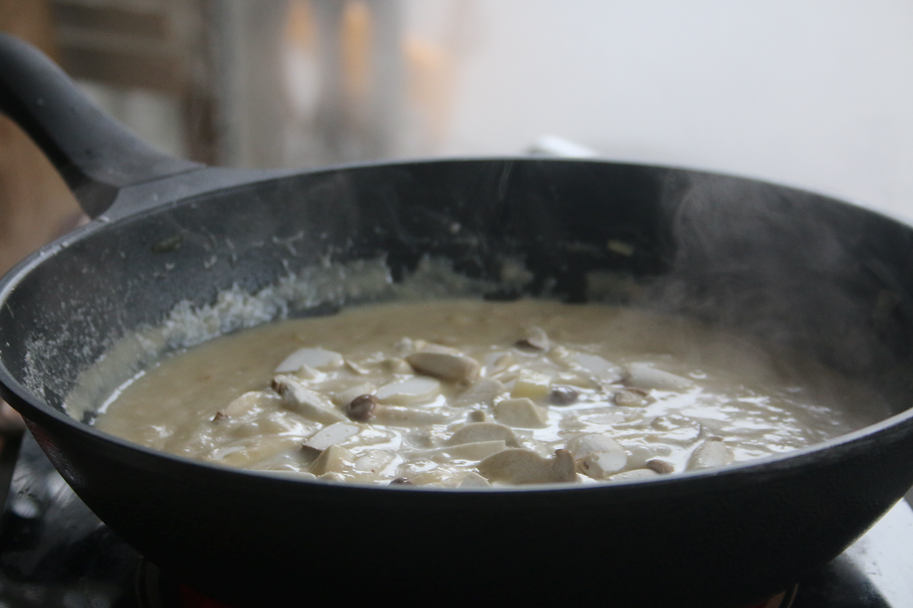 4) 양파와 감자가 으깨질 정도로 볶아지면, 오븐으로 구워낸 마늘 알알이를 까서 냄비에 넣고 분량의 크림과 우유를 부어준다. (생크림이 없다면 집에 남아 있는 치즈를 넣어도 된다. 국물은 전부 우유로 부어도 좋고, 조금 느끼하다면 물과 우유를 반반 섞어 넣어도 좋다.)