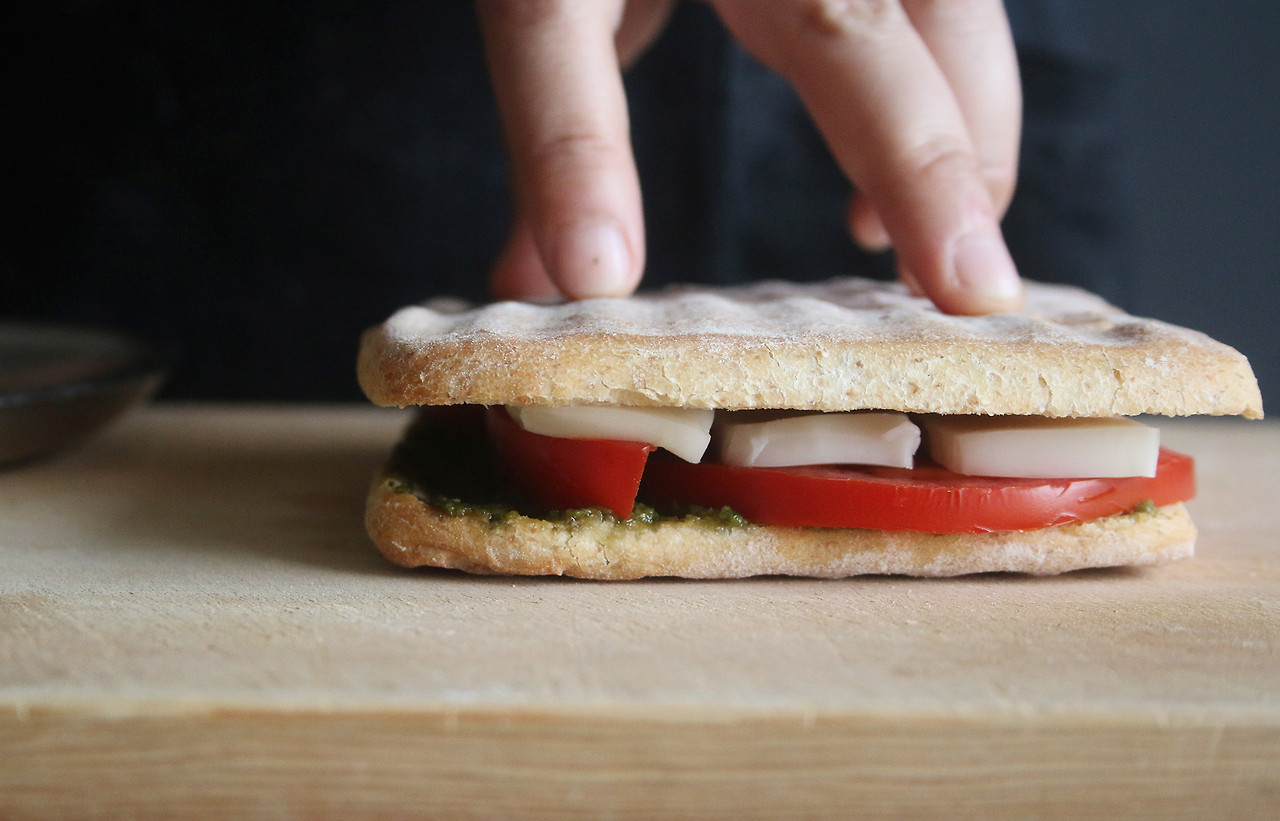 4. 위쪽 치아바타를 올리고 모짜렐라 치즈가 충분히 녹을 때까지(약 2~3분가량) 파니니 그릴에서 굽는다.