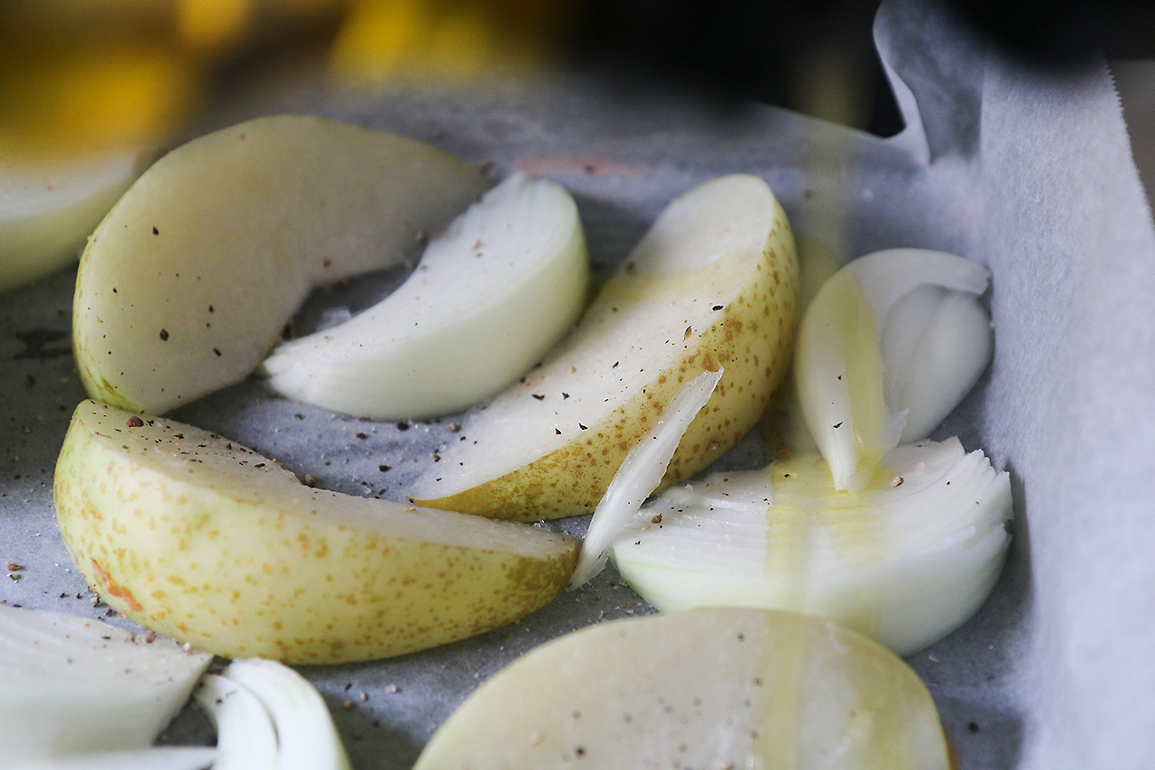 3. 오븐 팬에 종이 포일을 깔고 배와 양파를 올린 다음 소금과 후추를 뿌려주고 올리브 오일을 넉넉히 둘러준다.