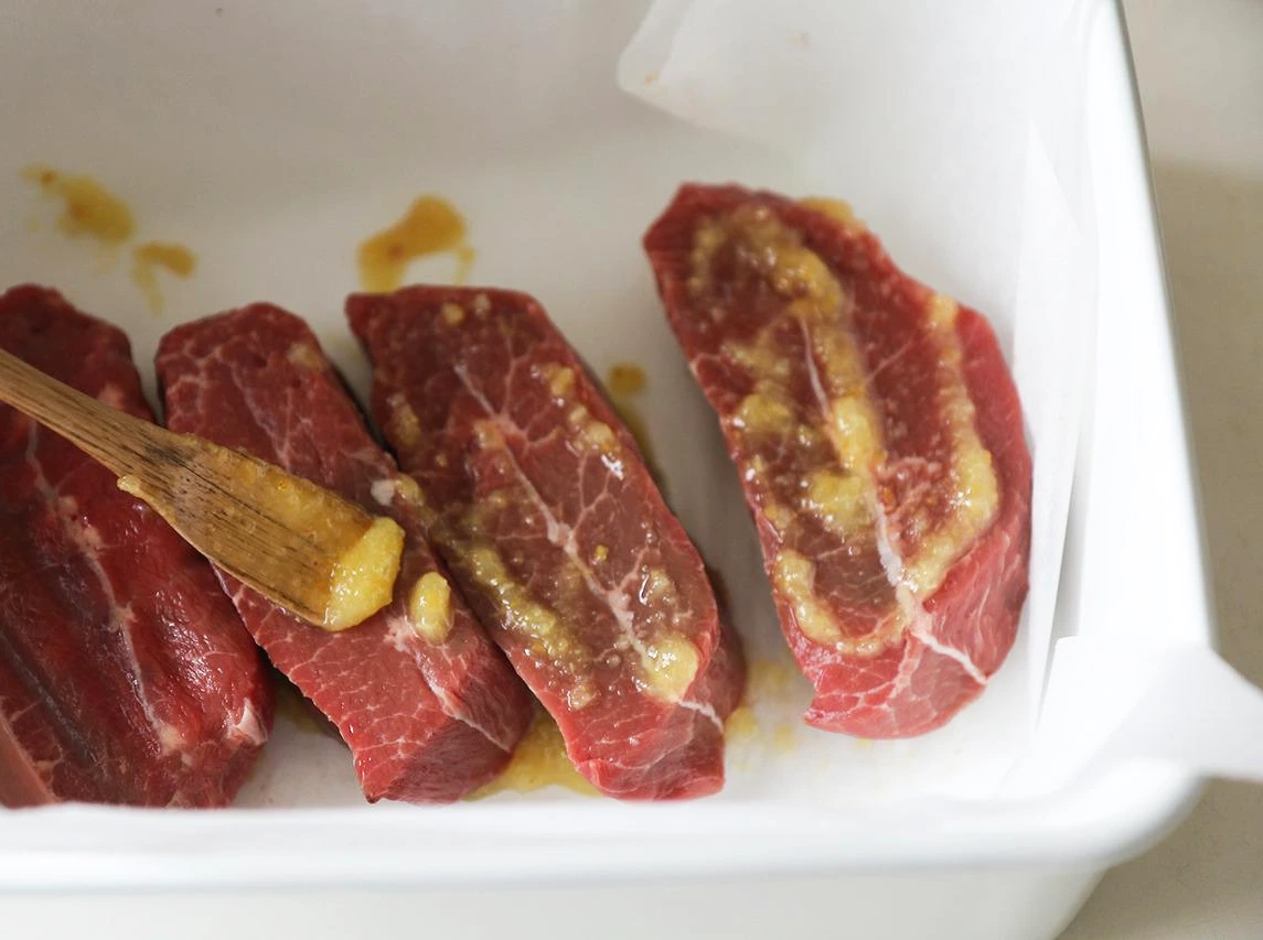 오븐에서 배가 익는 냄새가 날 때쯤, 후라이팬을 달궈 스테이크용 소고기를 겉면만 굽는다. 굽기 직전에 고기 표면에 하귤 소금을 발라 밑간을 해 주고, 버터와 올리브유를 함께 넣은 팬에서 튀기듯이 앞 뒤를 뒤집어 구워준다. 겉면에 전부 갈색빛이 돌면 양파와 배를 구워 놓은 오븐 팬에 함께 올리고 5분 정도 구워내면 완성.
