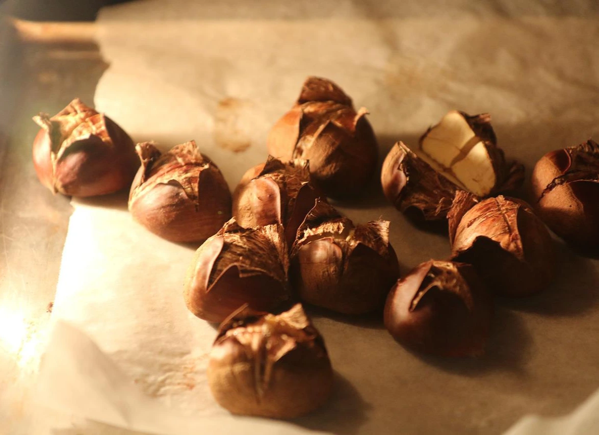 그 유명한 옥광밤은 아니더라도 껍질에 칼집을 넣어 오븐에 구워내면, 벌어지는 껍질 사이로 노란 속살이 드러난다. 단, 구운 밤의 속껍질을 곱게 벗겨 내려면, 아직 온기가 남아 있는 밤을 재빨리 작업해야 하기에 손끝을 불어가며 신속히 껍질을 발라내야 한다.