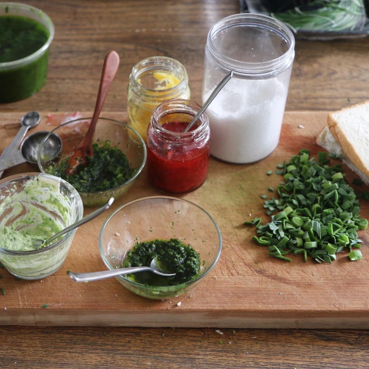 바질처럼 맛과 향이 뚜렷한 허브는 드문 편이지만, 그래도 나물로만 먹어 온 다양한 봄의 새순들 중에서도 바질처럼 요리의 양념장이나 소스로 만들어 볼 만한 향기가 있지 않을까, 하는 의문이 시작되었다. 비교적 뚜렷한 향기를 자랑하는 봄 새순들을 모으기 시작했다.