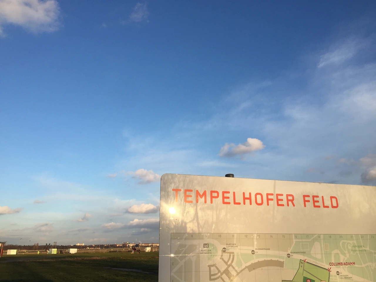 간절한 내 바람을 알았는지 한 시간쯤 걸려서 도착한 이 곳에서도 맑은 하늘을 계속해서 보게 해주었다. 분단 시절에 군사시설로 쓰였다는 공항. 그때의 모습을 일부분 간직한 채 지금은 베를린 최대 규모의 공원으로 탈바꿈하였고, 공항으로 쓰였던 곳이니만큼 탁 트인 공간과 중앙에 있는 활주로에 많은 사람들이 제일 먼저 눈에 들어왔다.
