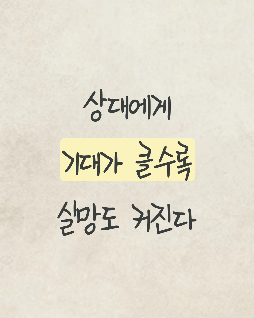 상대에게 바라는 마음이 클수록, 그만큼 실망할 가능성도 커진다. 관계를 맺는 과정에서 바람이 크다는 건, 상대방과 더 가까워지고 싶은 마음, 정서적 안정, 굳건한 믿음 등 복합적인 요소가 있다. 상대가 내 곁에 있어도 불안하고, 이미 많은 것을 나누었어도 여전히 부족하다고 느껴진다면, 자신에게 몇 가지 질문을 던져보자. "내가 진심으로 원하는 것은 무엇인지.", "상대에게 바라는 것들이 혹시 스스로 채워야 할 부분은 아닌지."