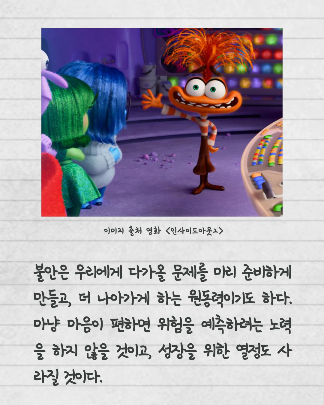 불안은 우리에게 다가올 문제를 미리 준비하게 만들고, 더 나아가게 하는 원동력이기도 하다. 마냥 마음이 편하면 위험을 예측하려는 노력을 하지 않을 것이고, 성장을 위한 열정도 사라질 것이다.