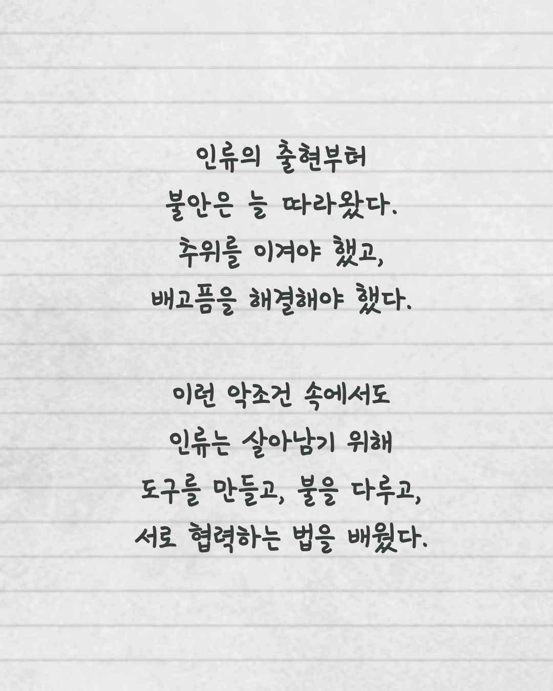 인류의 출현부터 불안은 늘 따라왔다. 추위를 이겨야 했고, 배고픔을 해결해야 했다. 이런 악조건 속에서도 인류는 살아남기 위해 도구를 만들고, 불을 다루고, 서로 협력하는 법을 배웠다.