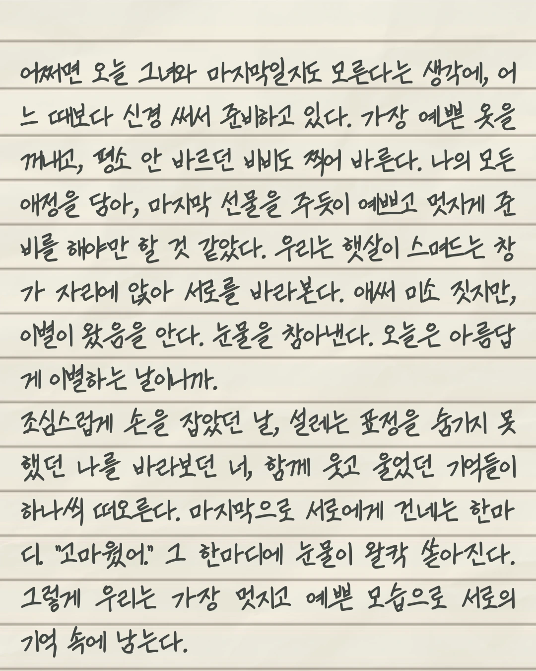 조심스럽게 손을 잡았던 날, 설레는 표정을 숨기지 못했던 나를 바라보던 너, 함께 웃고 울었던 기억들이 하나씩 떠오른다. 마지막으로 서로에게 건네는 한마디. “고마웠어.” 그 한마디에 눈물이 왈칵 쏟아진다. 그렇게 우리는 가장 멋지고 예쁜 모습으로 서로의 기억 속에 남는다.