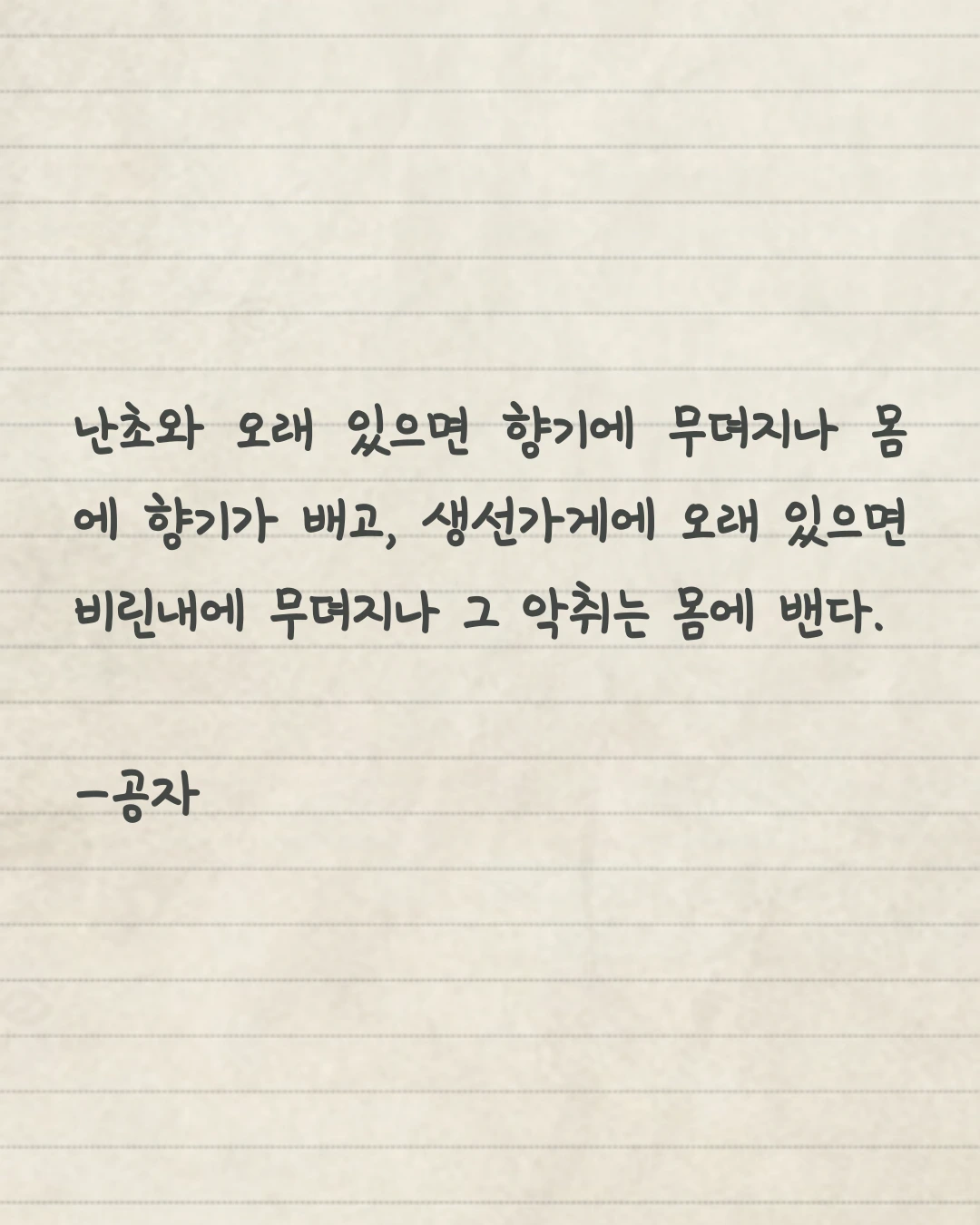 난초와 오래 있으면 향기에 무뎌지나 몸에 향기가 배고, 생선가게에 오래 있으면 비린내에 무뎌지나 그 악취는 몸에 밴다.