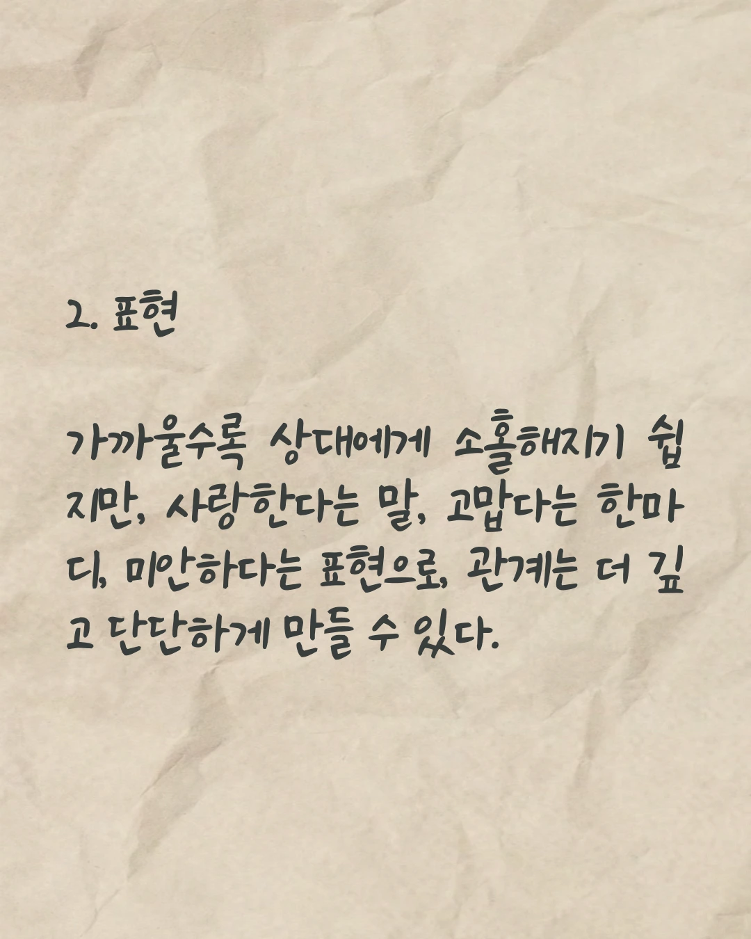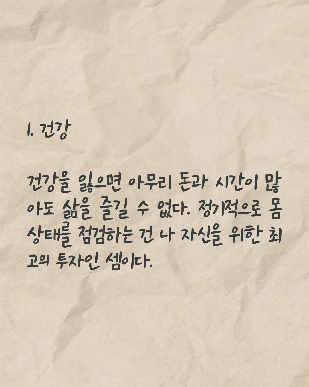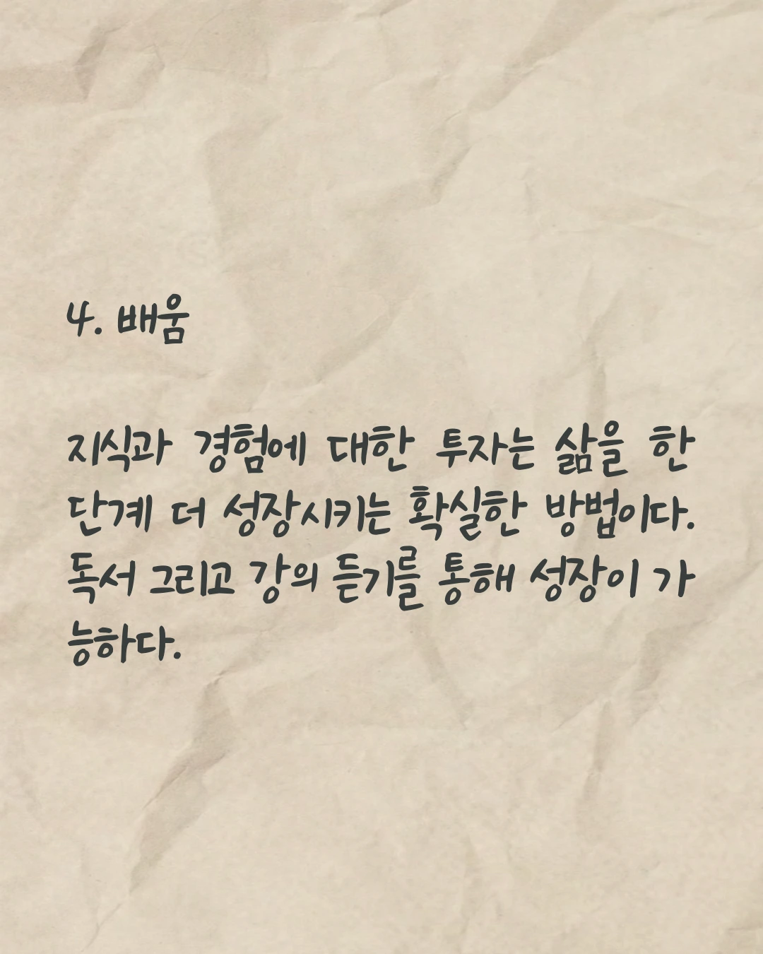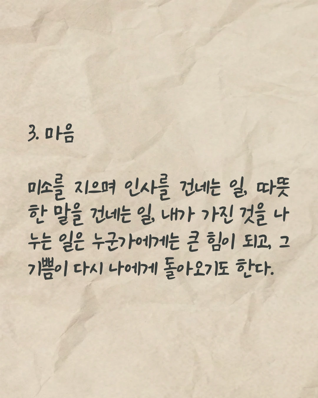 베풀 줄 안다는 건 관계를 단단히 이어주는 마음씨가 있다는 것이고, 배우는 태도는 지속적인 성장을 가능하게 하며, 건강과 마음을 돌봐야 삶을 온전히 누릴 수 있게 된다.